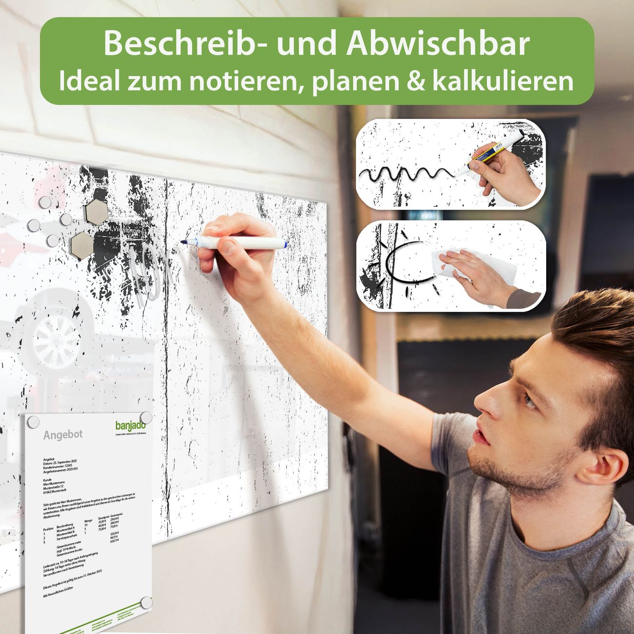 Bitte beachten Sie, dass ausschliessliche spezielle Magnete an der Glastafel haften. Wir empfehlen banjado Neodym Magnete, diese sind durch uns auf Wirksamkeit geprüft.