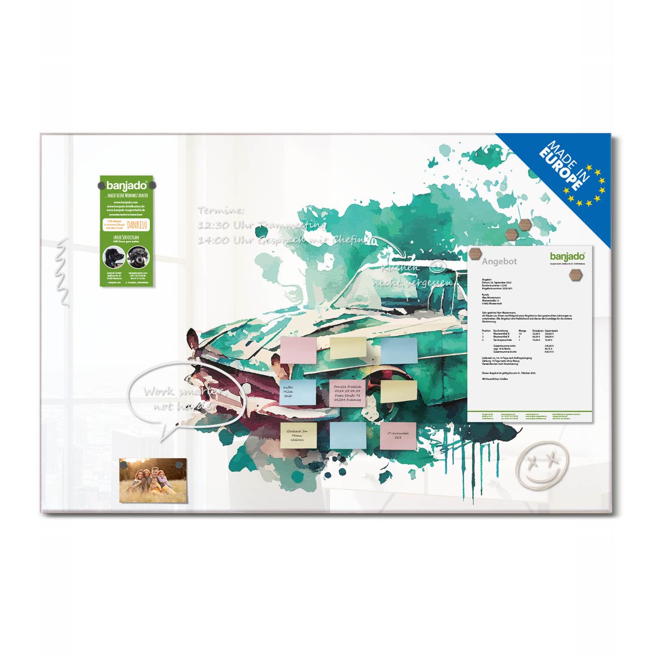 Material: 4mm Sicherheitsglas mit Metallrückwand Eigenschaften: beschreibbar, magnetisch, kratzfest Maße: 120x80x0,6cm, 14,40kg schwer Motiv Nummer 13146 Vintage Auto Aquarell Zubehör: inklusive 4 Neodym-Magnete