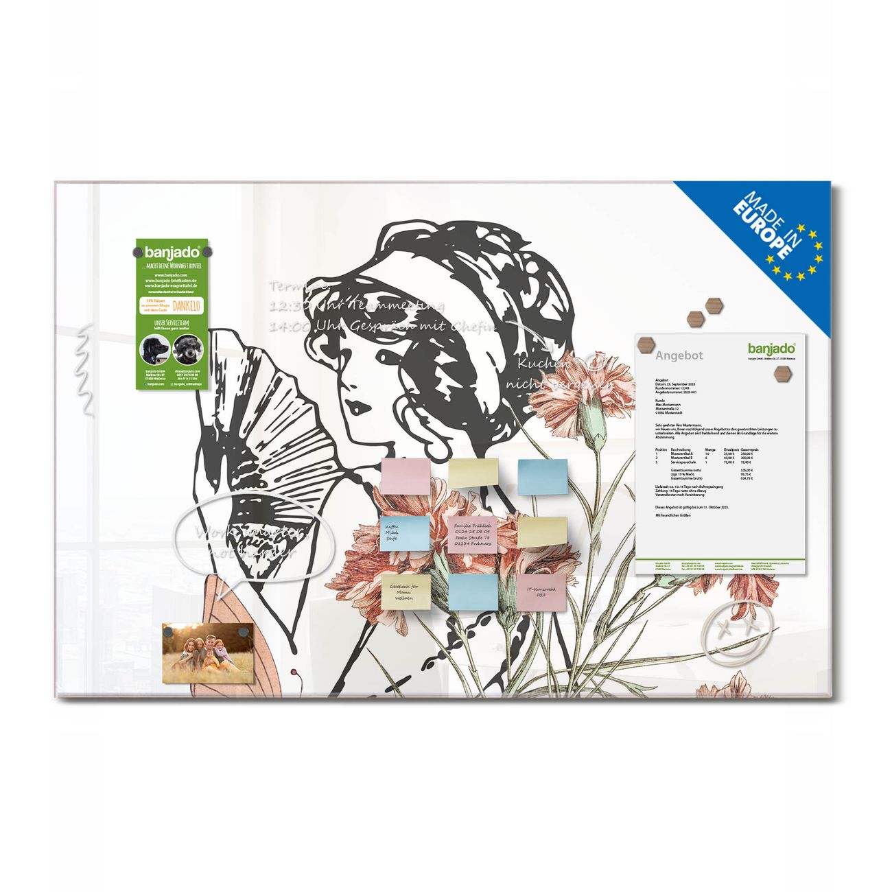 Ein Stück Design, das Ihren Alltag organisiert. Schreiben, heften, inspirieren - alles an einem Ort. Qualität, die man spürt. Montage leicht gemacht. Handwerk mit Herz - veredelt in Sachsen. Einzigartiges Design mit Motiv Motiv Vintage Blumenfrau Beschreibbare Glasoberfläche, leicht zu reinigen Starke Magnetkraft durch Stahlrückwand Inklusive 4 Neodym-Magneten Flexible Montageoptionen Handveredelt in Sachsen - Qualität, die bleibt
