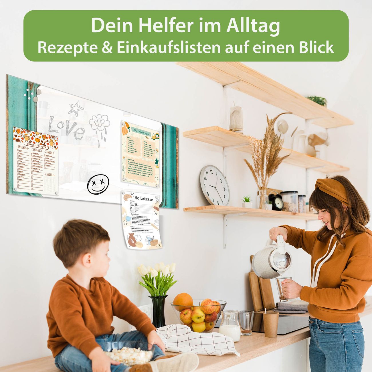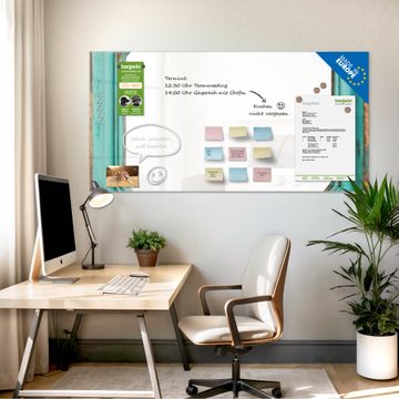 Auf der glatten Glasoberfläche lassen sich Termine, Rezepte oder Notizen ganz einfach mit Kreidestiften festhalten und rückstandslos entfernen. Starke Neodym-Magnete halten Ihre wichtigsten Erinnerungen sicher an Ort und Stelle. So entsteht Ihre ganz persönliche Ideenwand - jeden Tag neu.