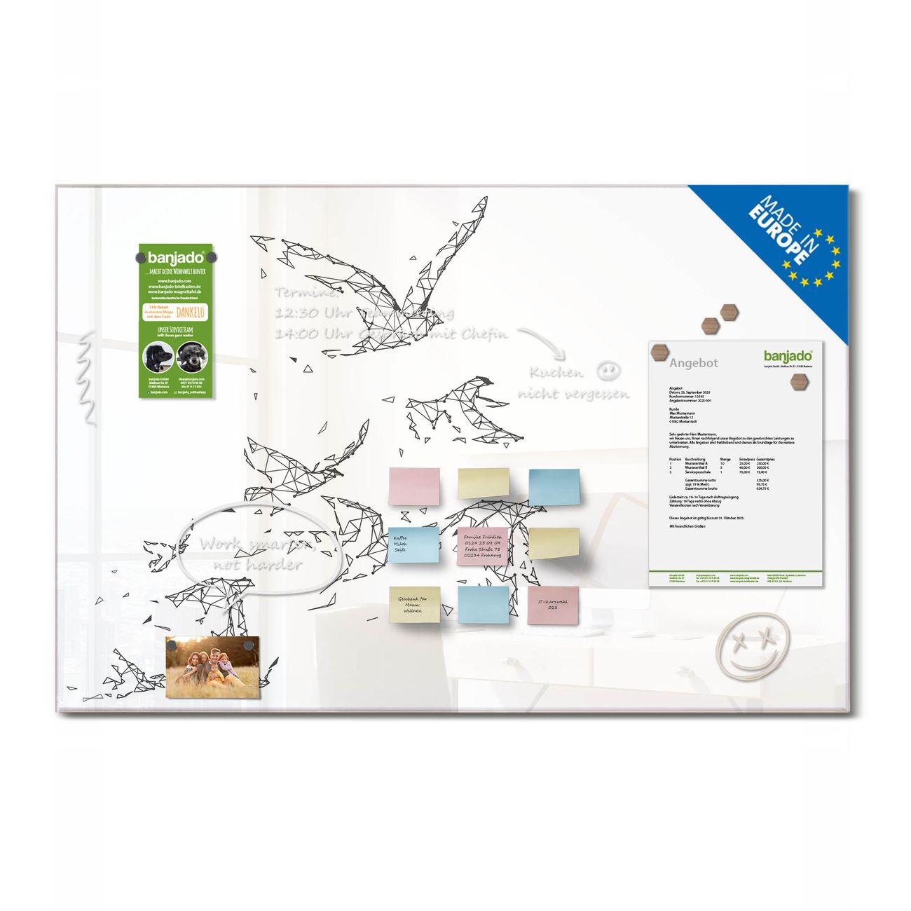 Material: 4mm Sicherheitsglas mit Metallrückwand Eigenschaften: beschreibbar, magnetisch, kratzfest Maße: 120x80x0,6cm, 14,40kg schwer Motiv Nummer 13022 Vögel abstrakt 2 Zubehör: inklusive 4 Neodym-Magnete