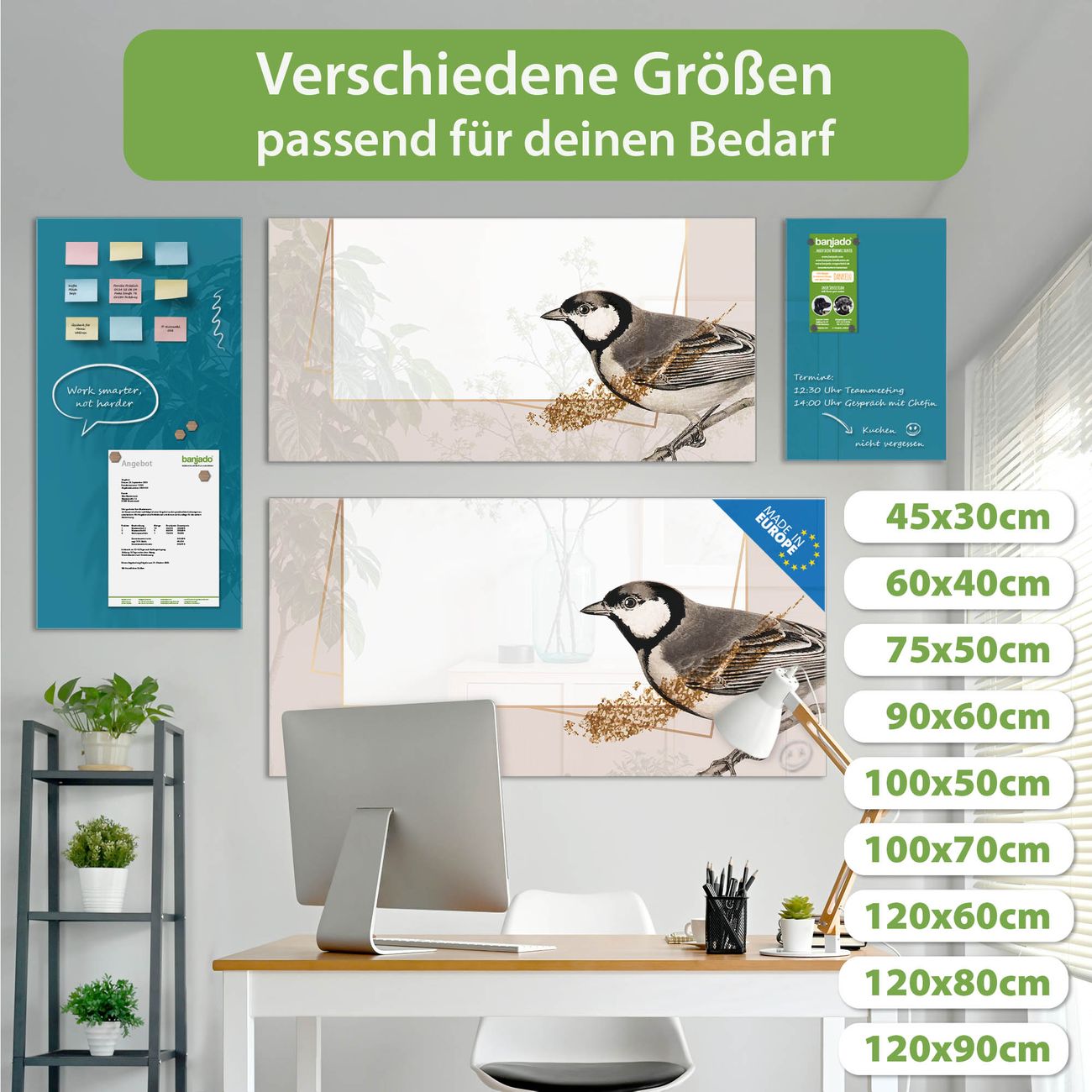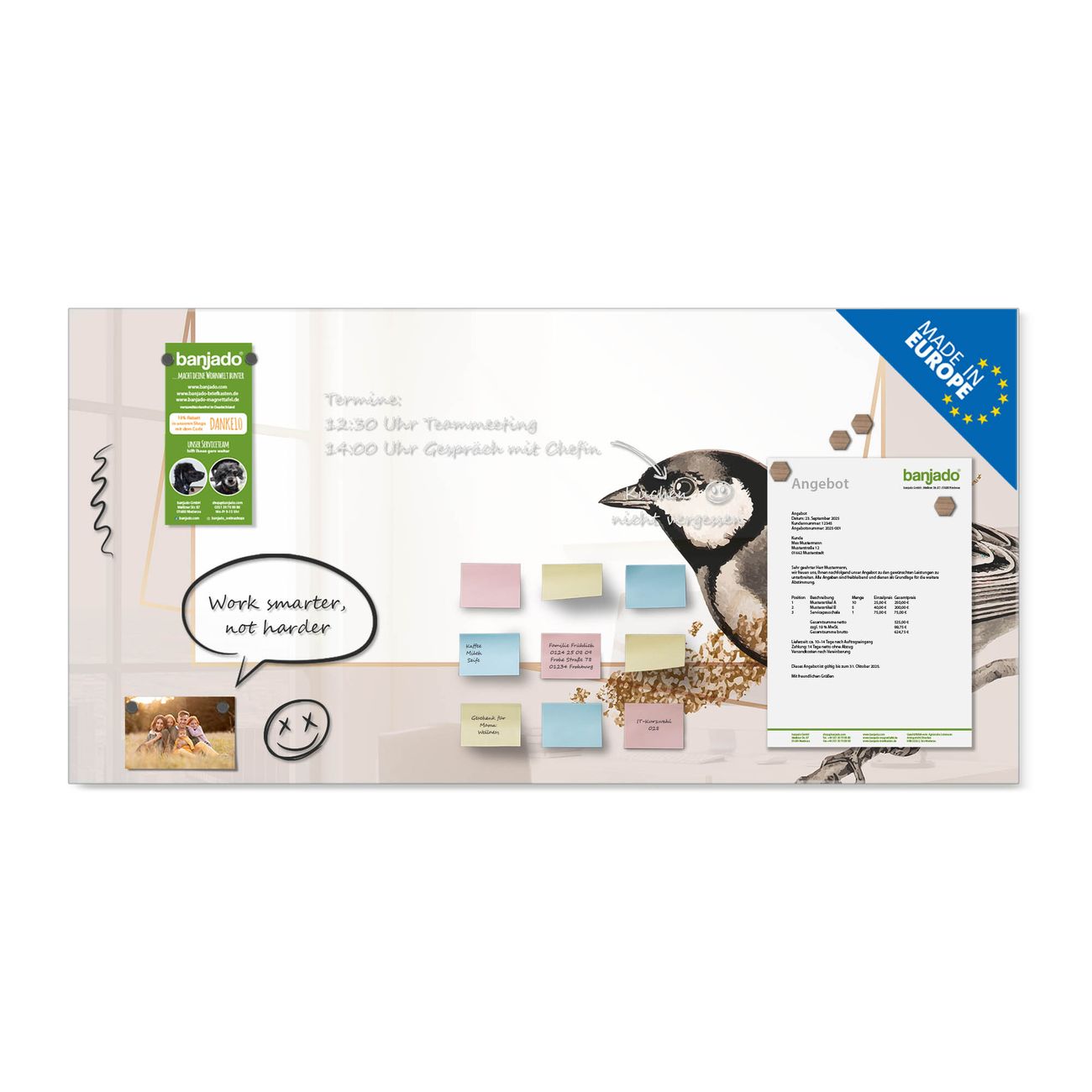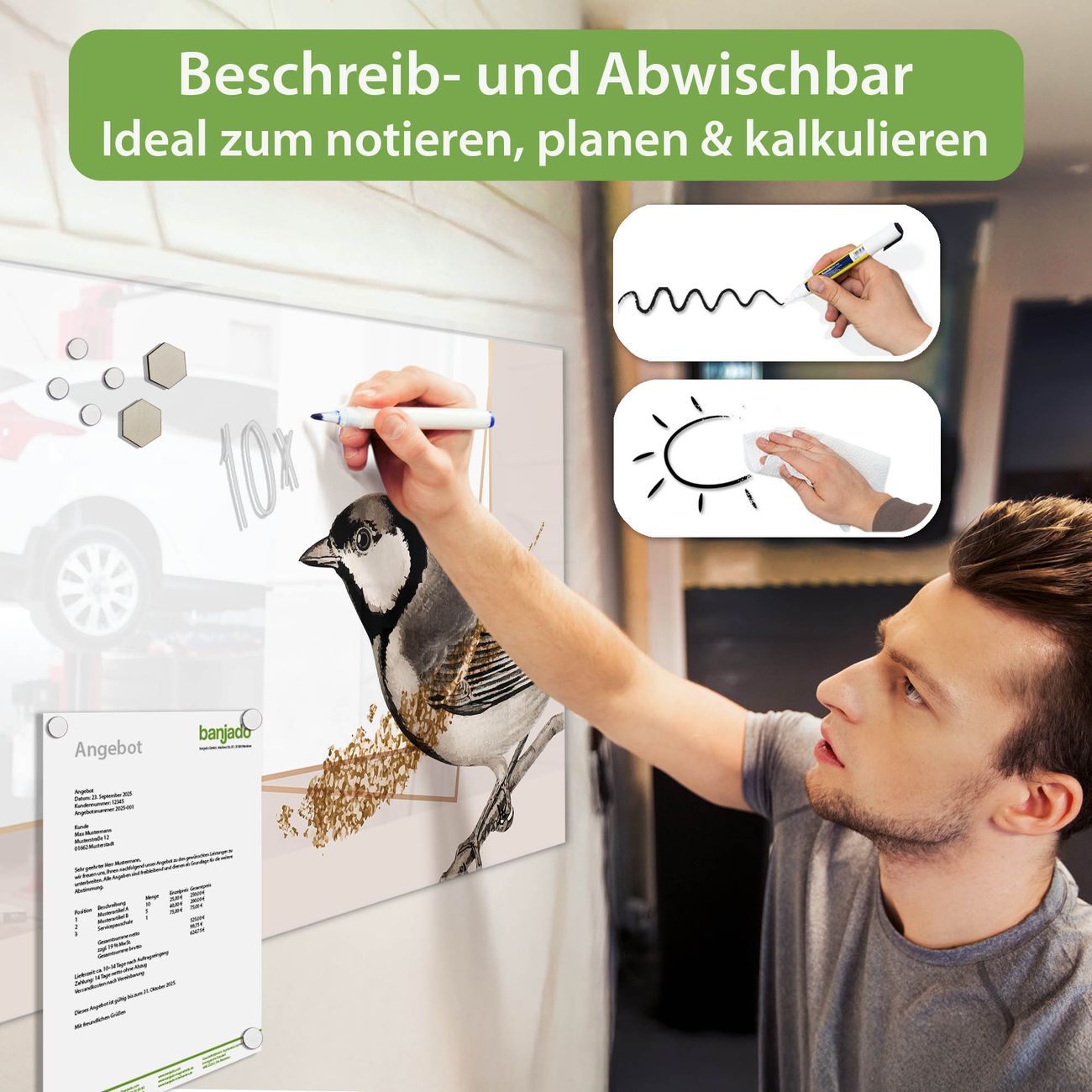 Material: 4mm Sicherheitsglas mit Metallrückwand Eigenschaften: beschreibbar, magnetisch, kratzfest Maße: 110x55x0,6cm, 9,08kg schwer Motiv Nummer 13491 Vogel auf Zweig 2 Zubehör: inklusive 4 Neodym-Magnete