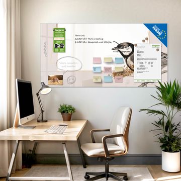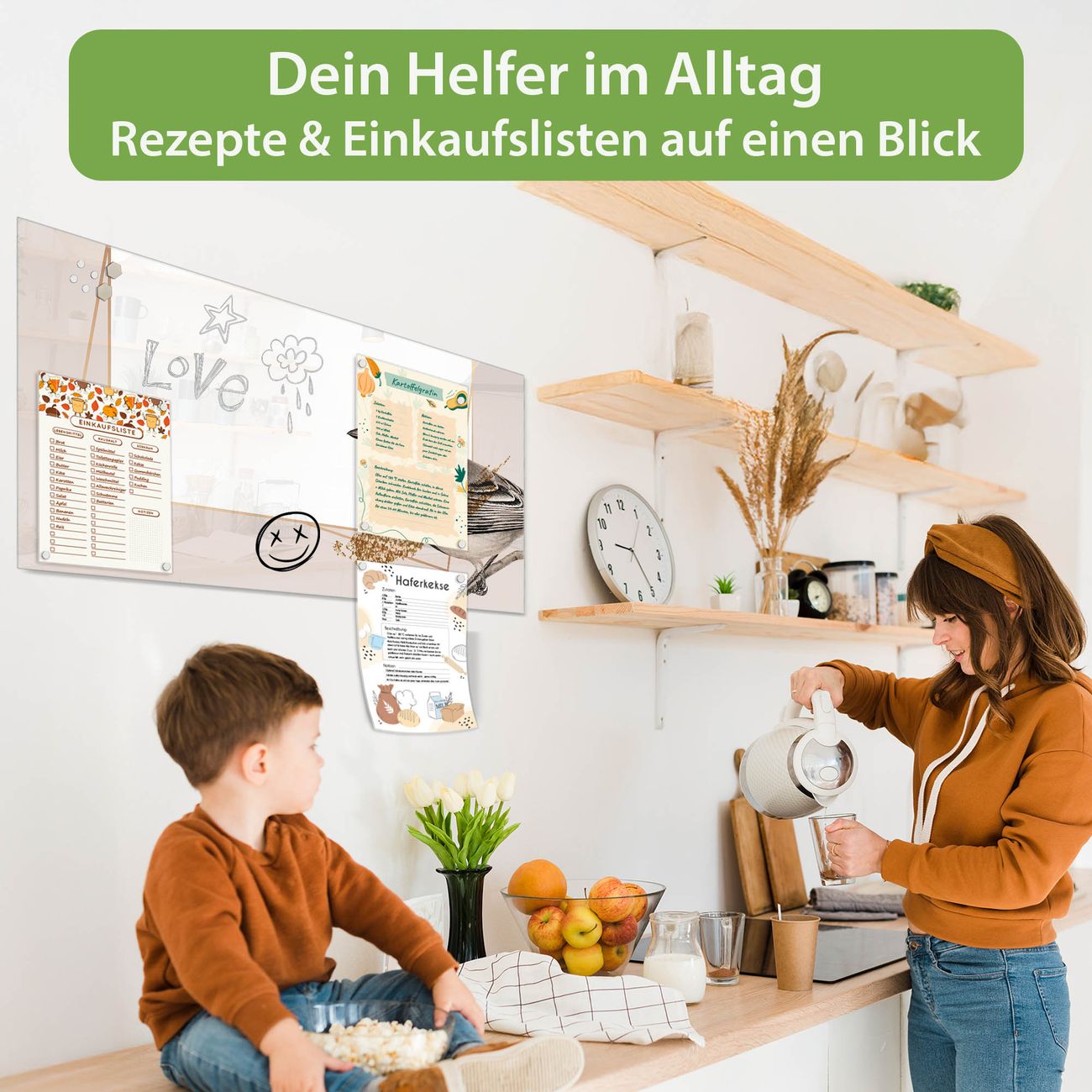 Auf der glatten Glasoberfläche lassen sich Termine, Rezepte oder Notizen ganz einfach mit Kreidestiften festhalten und rückstandslos entfernen. Starke Neodym-Magnete halten Ihre wichtigsten Erinnerungen sicher an Ort und Stelle. So entsteht Ihre ganz persönliche Ideenwand - jeden Tag neu.