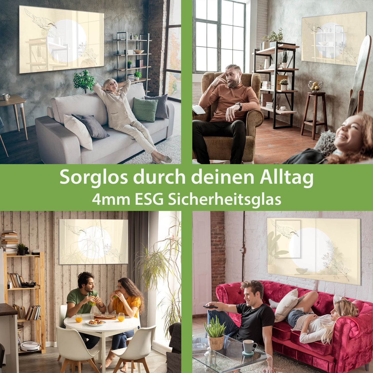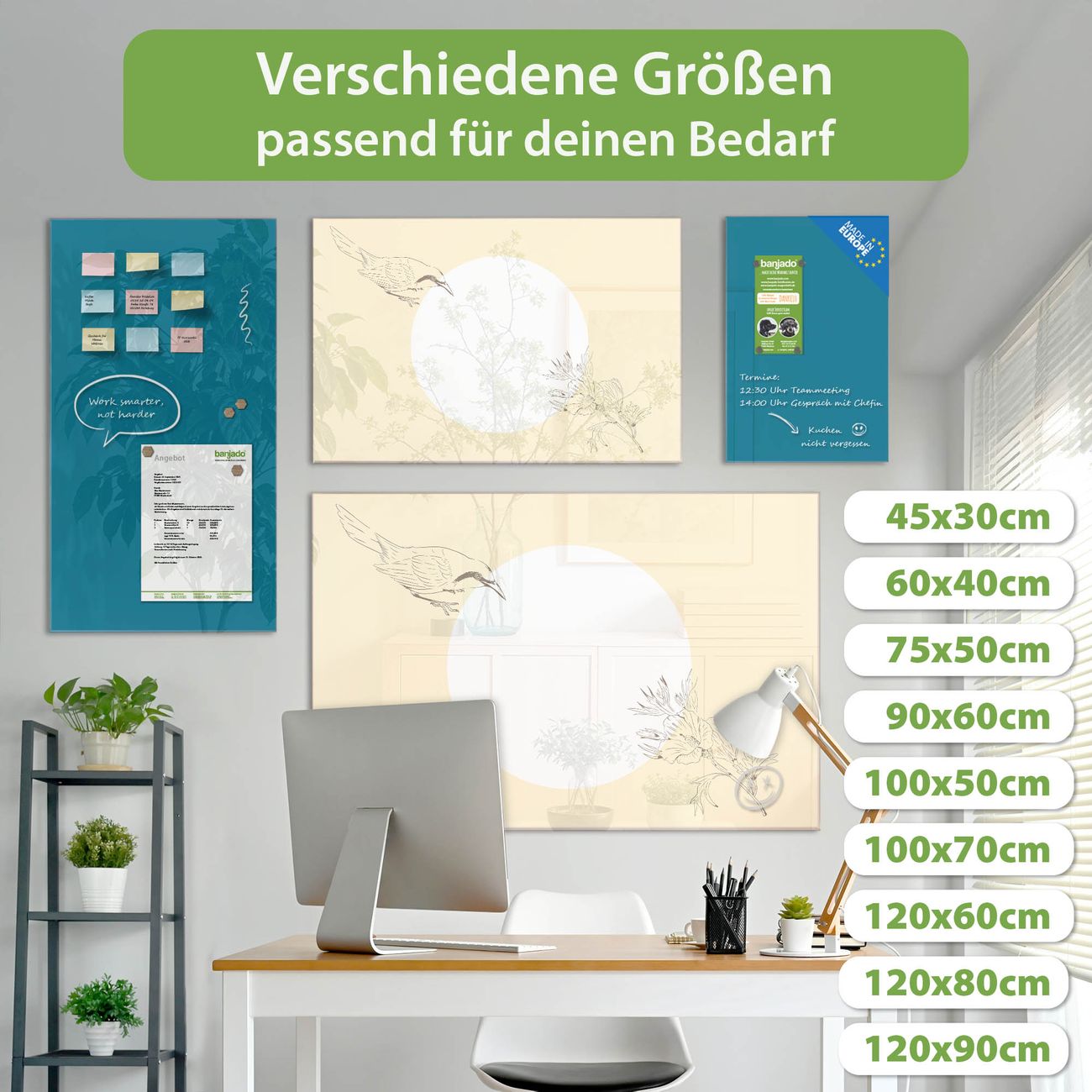 Material: 4mm Sicherheitsglas mit Metallrückwand Eigenschaften: beschreibbar, magnetisch, kratzfest Maße: 75x50x0,6cm, 5,63kg schwer Motiv Nummer 13542 Vogel und Blüte Zubehör: inklusive 4 Neodym-Magnete