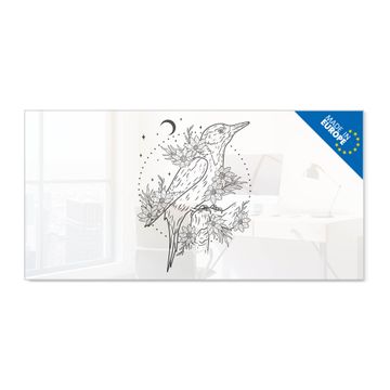 Material: 4mm Sicherheitsglas mit Metallrückwand Eigenschaften: beschreibbar, magnetisch, kratzfest Maße: 100x50x0,6cm, 7,50kg schwer Motiv Nummer 13487 Vogel und Blumen im Mondlicht Zubehör: inklusive 4 Neodym-Magnete