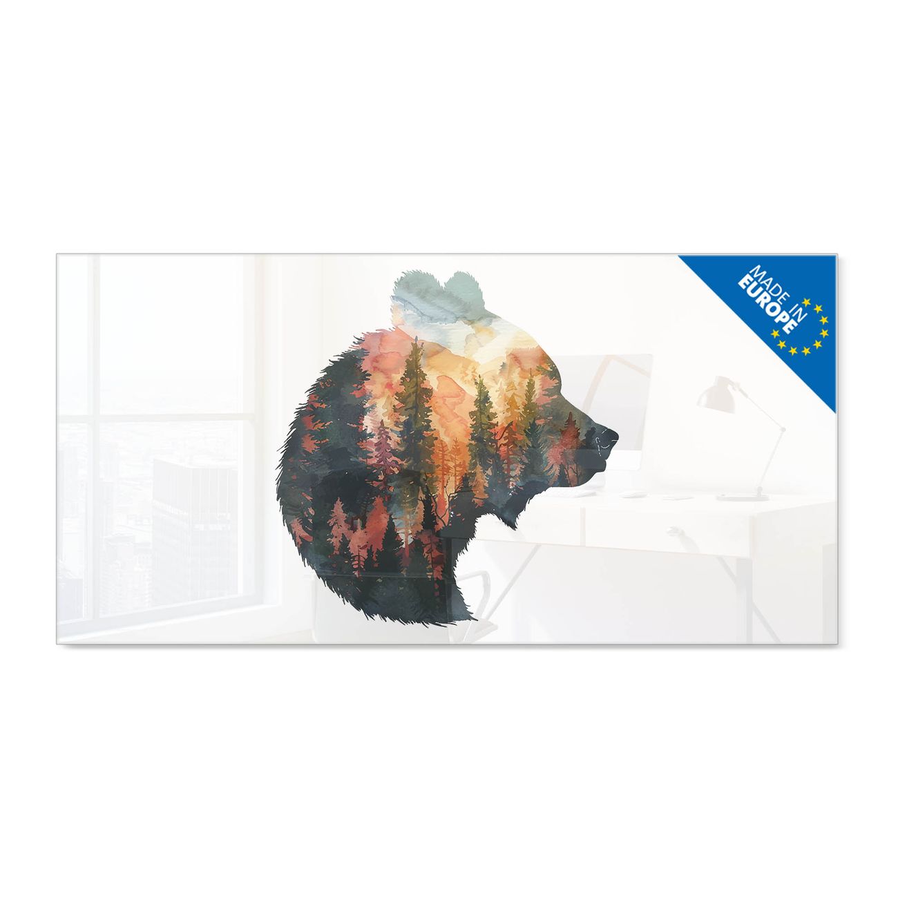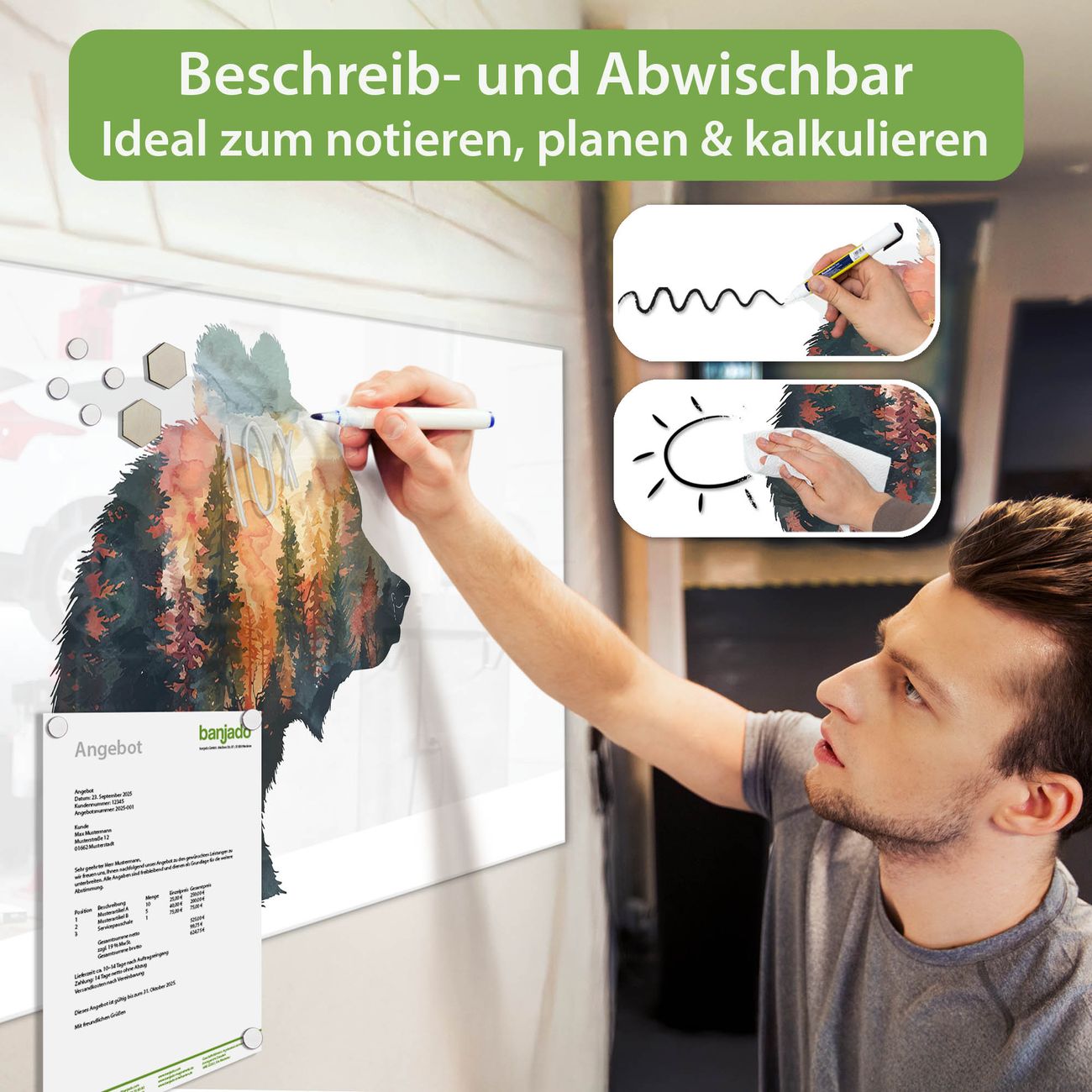 Material: 4mm Sicherheitsglas mit Metallrückwand Eigenschaften: beschreibbar, magnetisch, kratzfest Maße: 100x50x0,6cm, 7,50kg schwer Motiv Nummer 13467 Wald und Bär Zubehör: inklusive 4 Neodym-Magnete