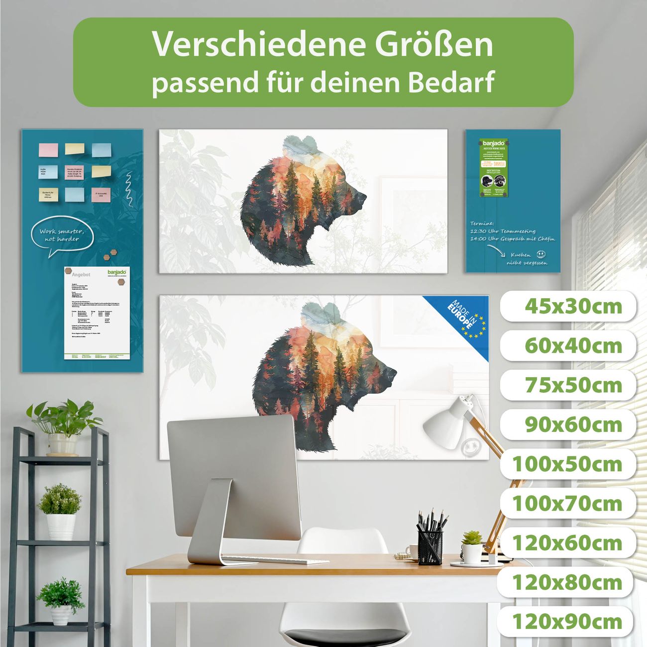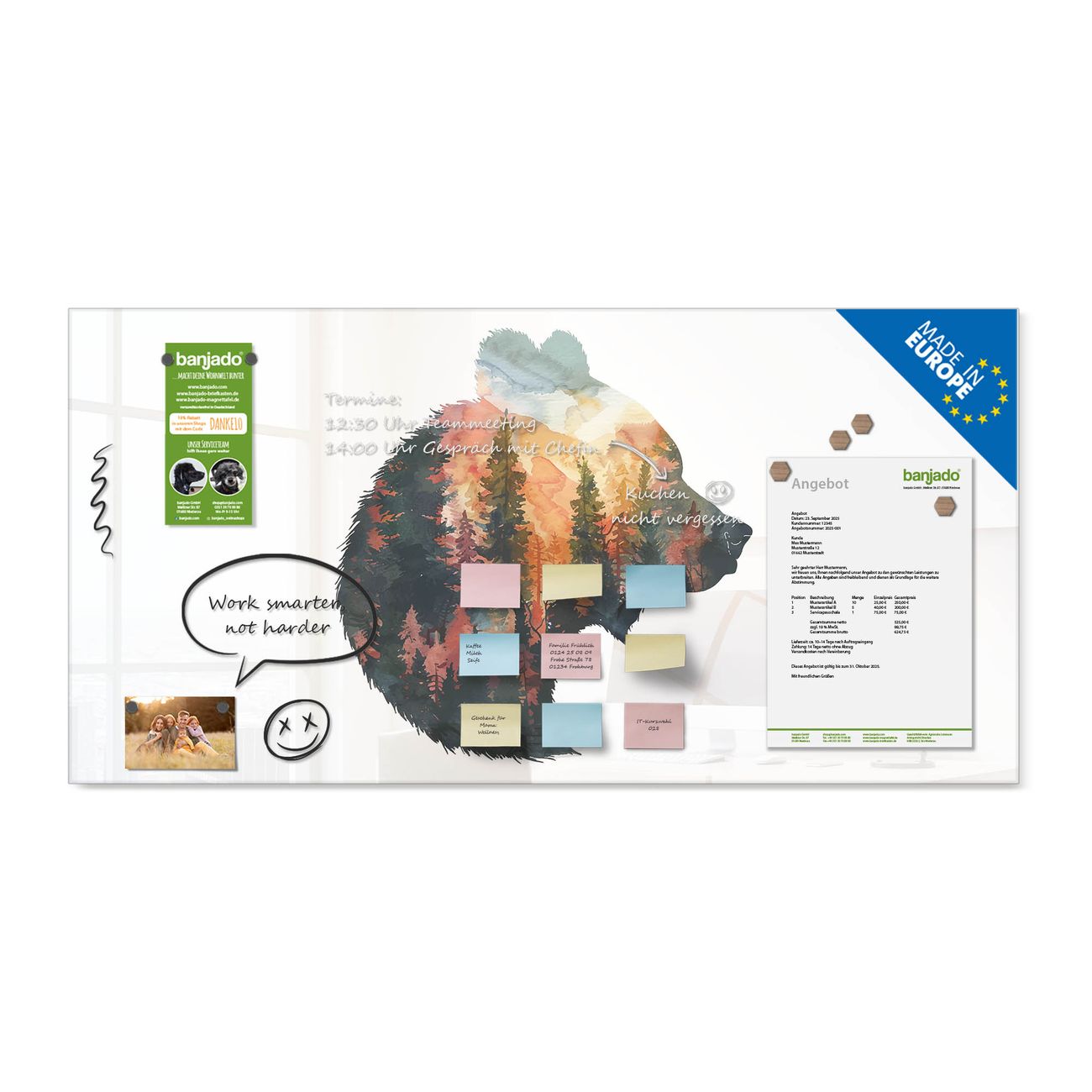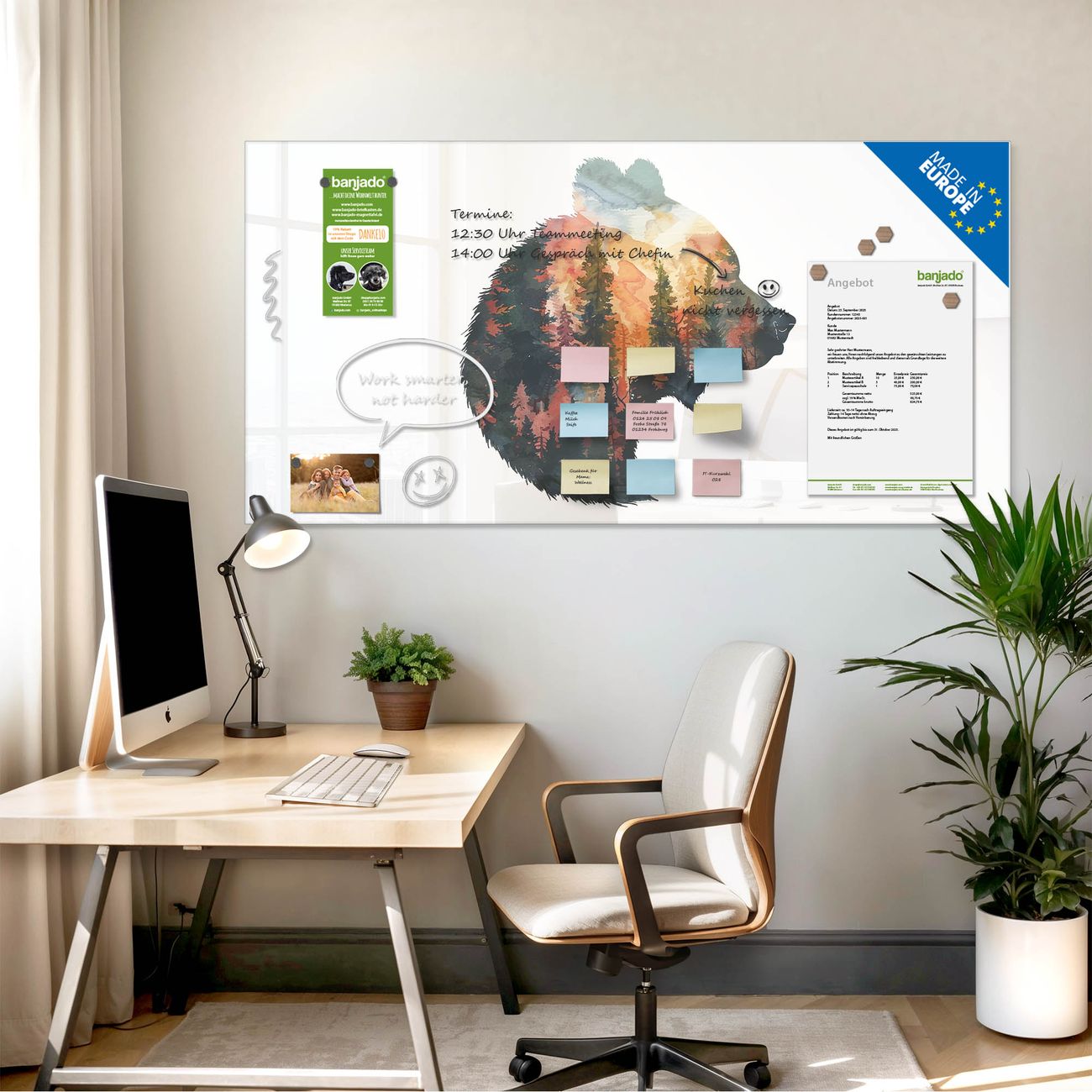Jede Glas Magnettafel wird in unserer Werkstatt von Hand gefertigt und sorgfältig geprüft. So erhalten Sie ein echtes Qualitätsprodukt, das Funktion und Ästhetik perfekt vereint.?? Warum banjado?