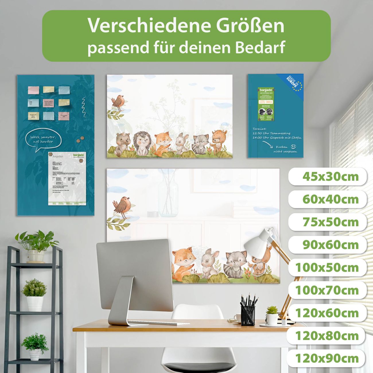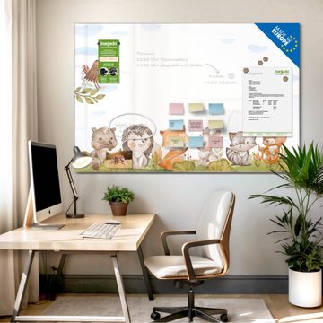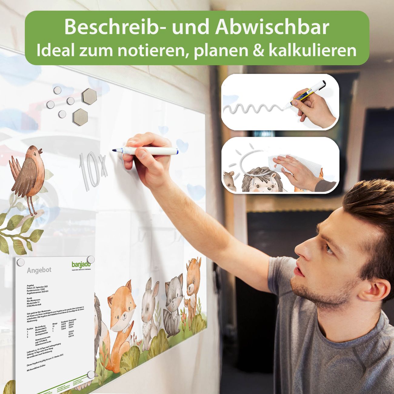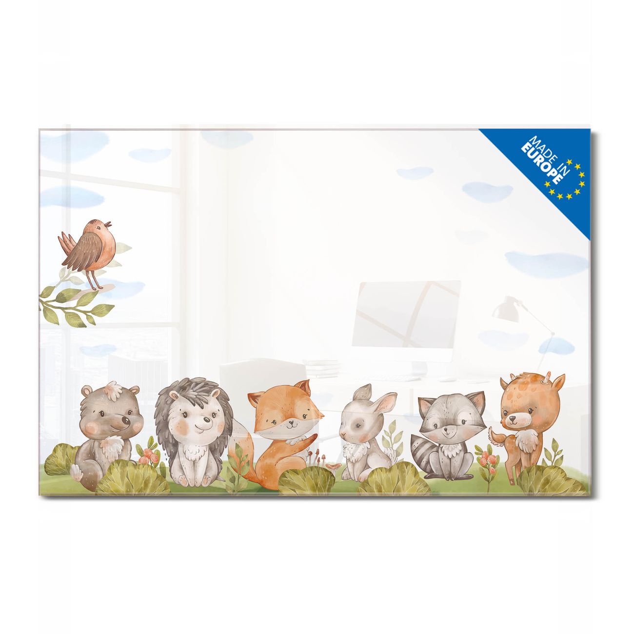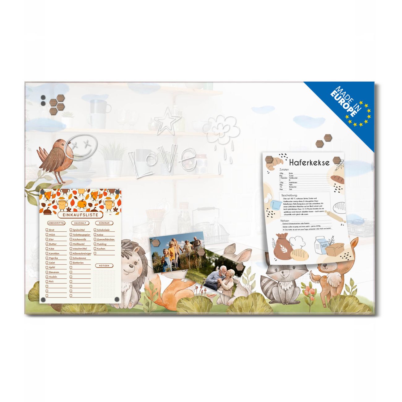 Material: 4mm Sicherheitsglas mit Metallrückwand Eigenschaften: beschreibbar, magnetisch, kratzfest Maße: 75x50x0,6cm, 5,63kg schwer Motiv Nummer 13262 Waldfreunde 2 Zubehör: inklusive 4 Neodym-Magnete