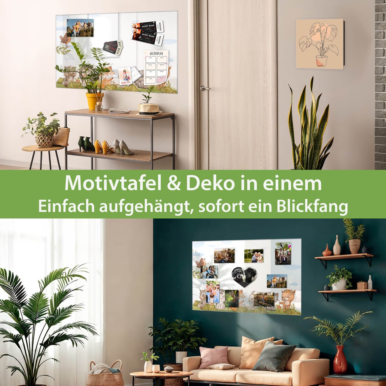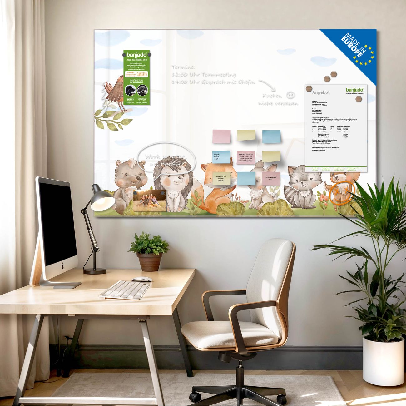 Die banjado Glas Magnettafel mit dem Motiv Motiv Waldfreunde 2 verbindet Funktionalität mit Stil. Sie ersetzt das Zettelchaos durch klare Strukturen und bringt dabei eine warme, natürliche Atmosphäre in Ihr Zuhause. Ob im Büro, in der Küche oder im Eingangsbereich - dieses Design-Board zieht Blicke an und sorgt für Ordnung mit Charakter.