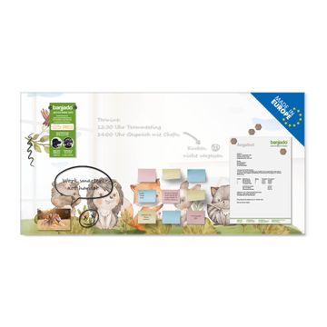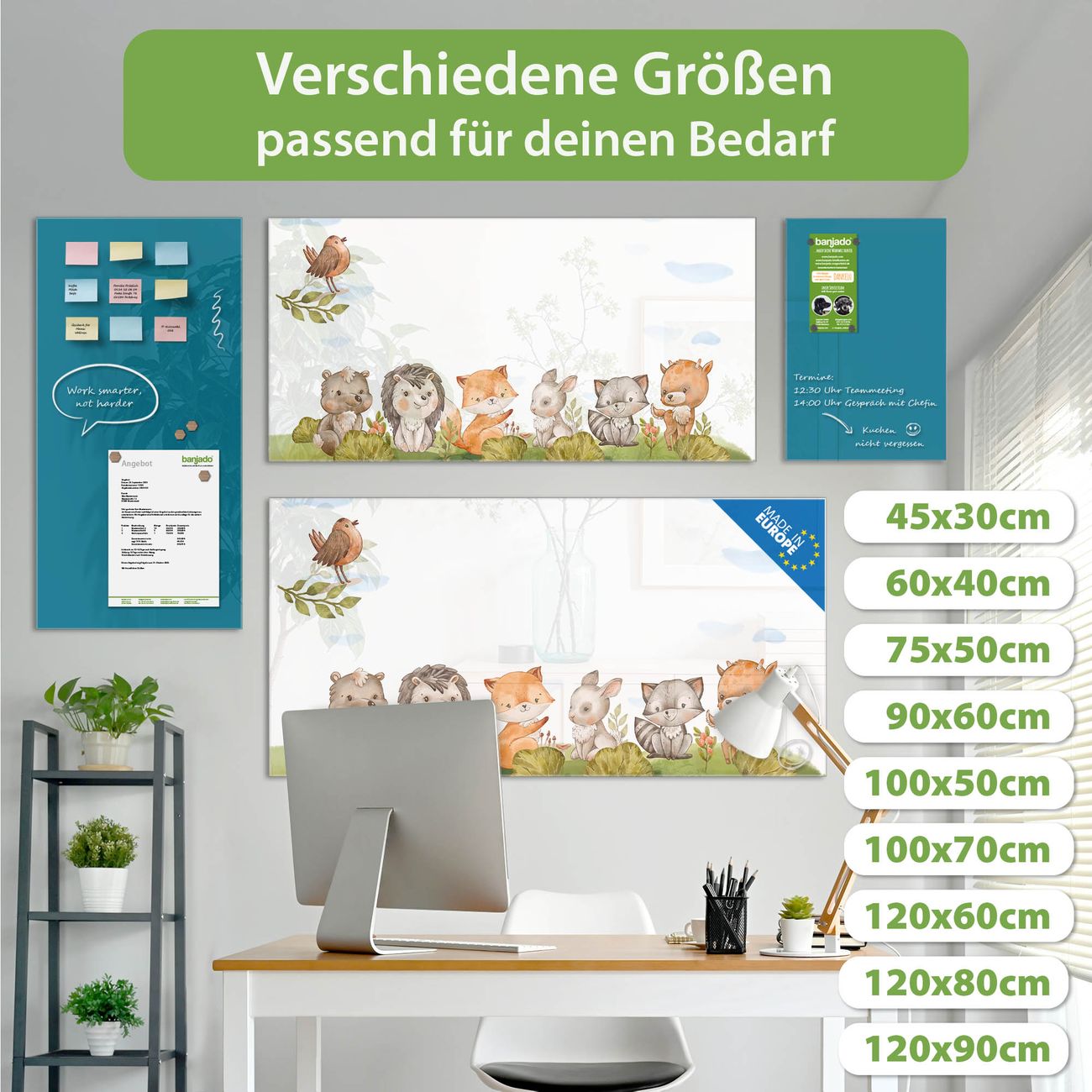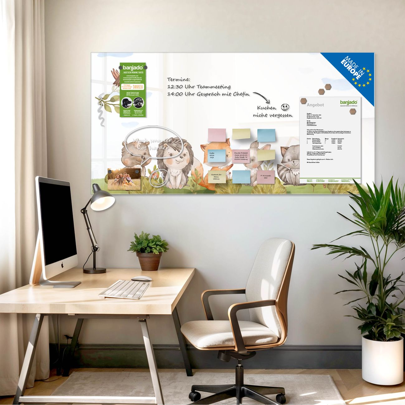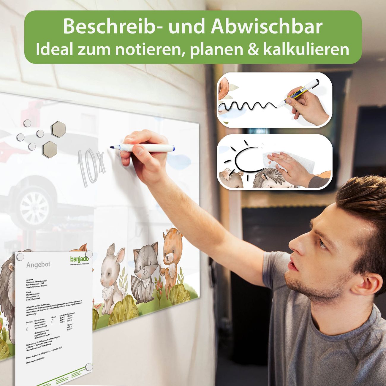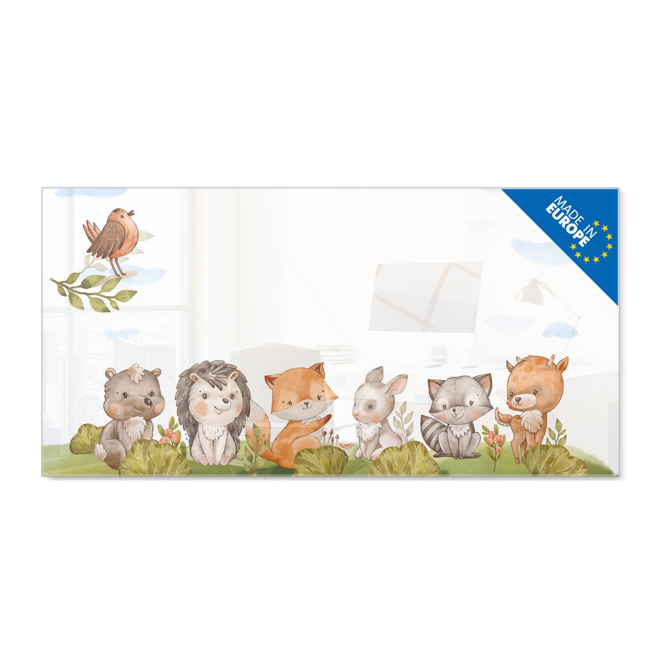 Material: 4mm Sicherheitsglas mit Metallrückwand Eigenschaften: beschreibbar, magnetisch, kratzfest Maße: 100x50x0,6cm, 7,50kg schwer Motiv Nummer 13262 Waldfreunde 2 Zubehör: inklusive 4 Neodym-Magnete