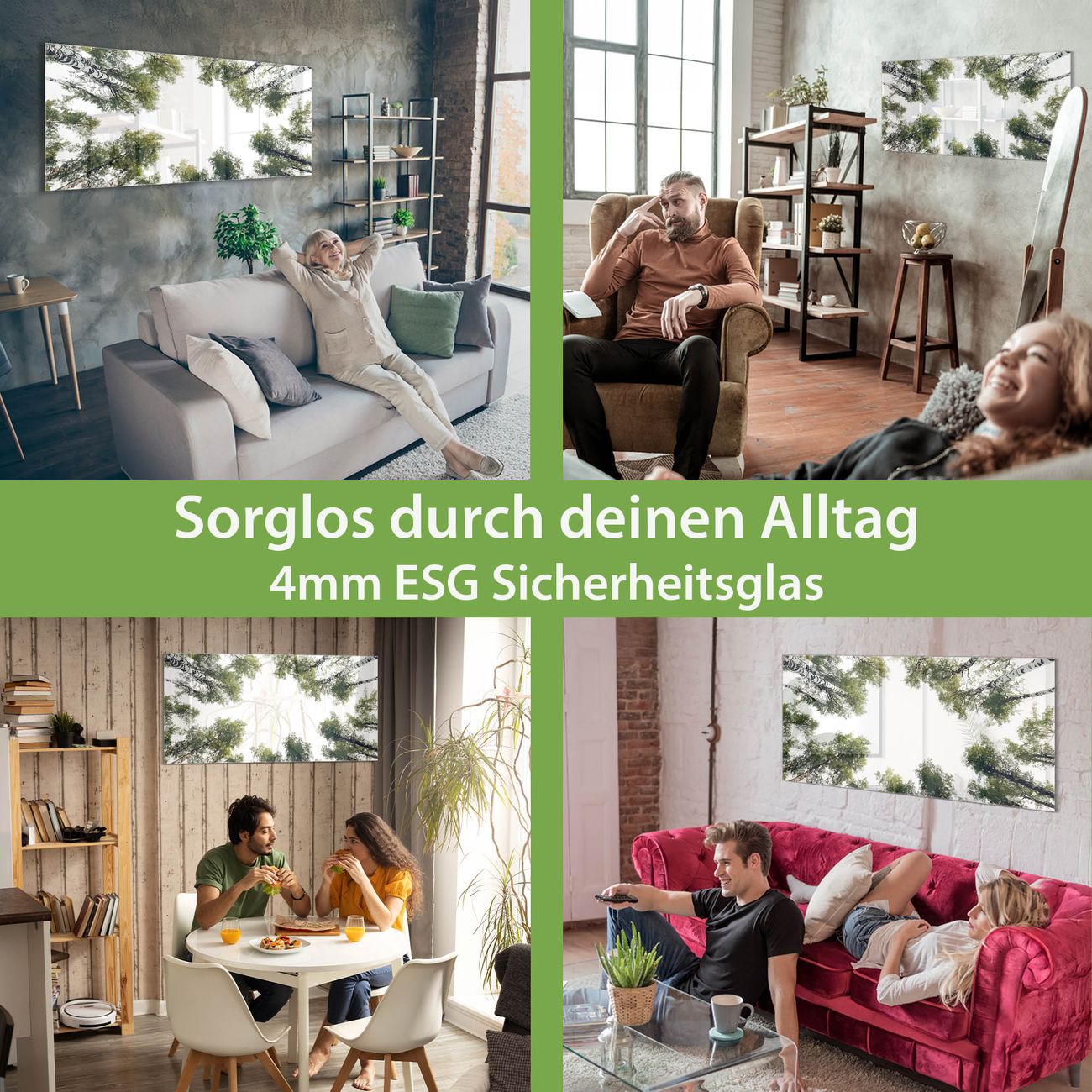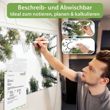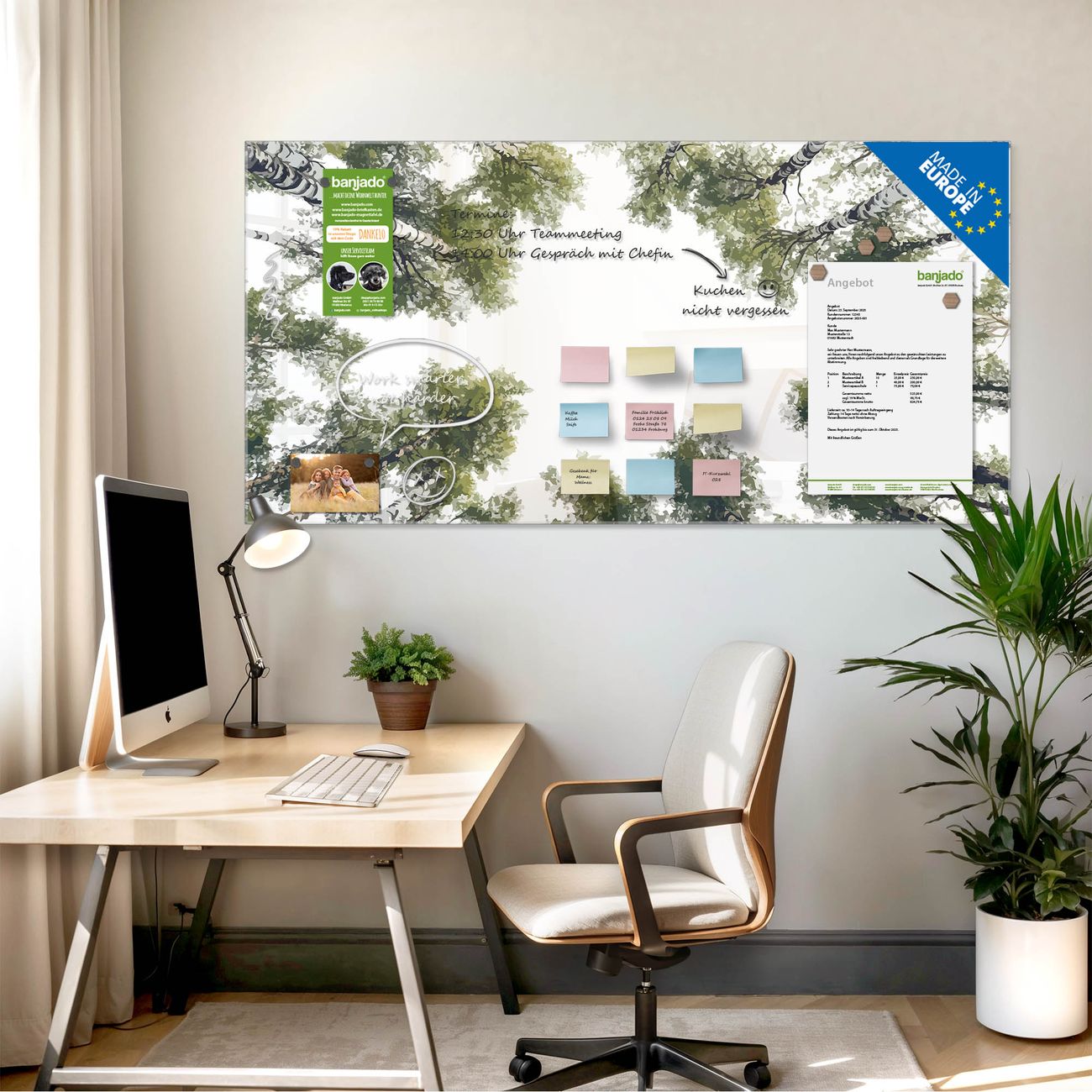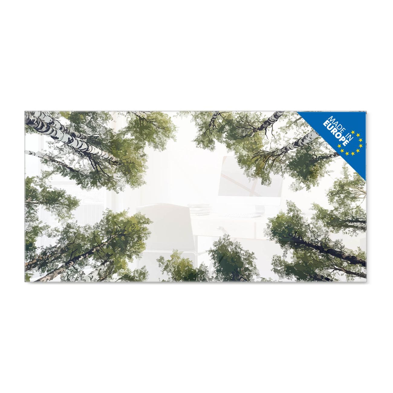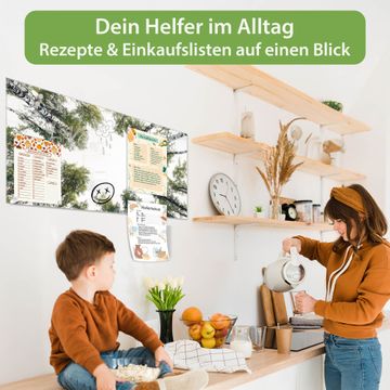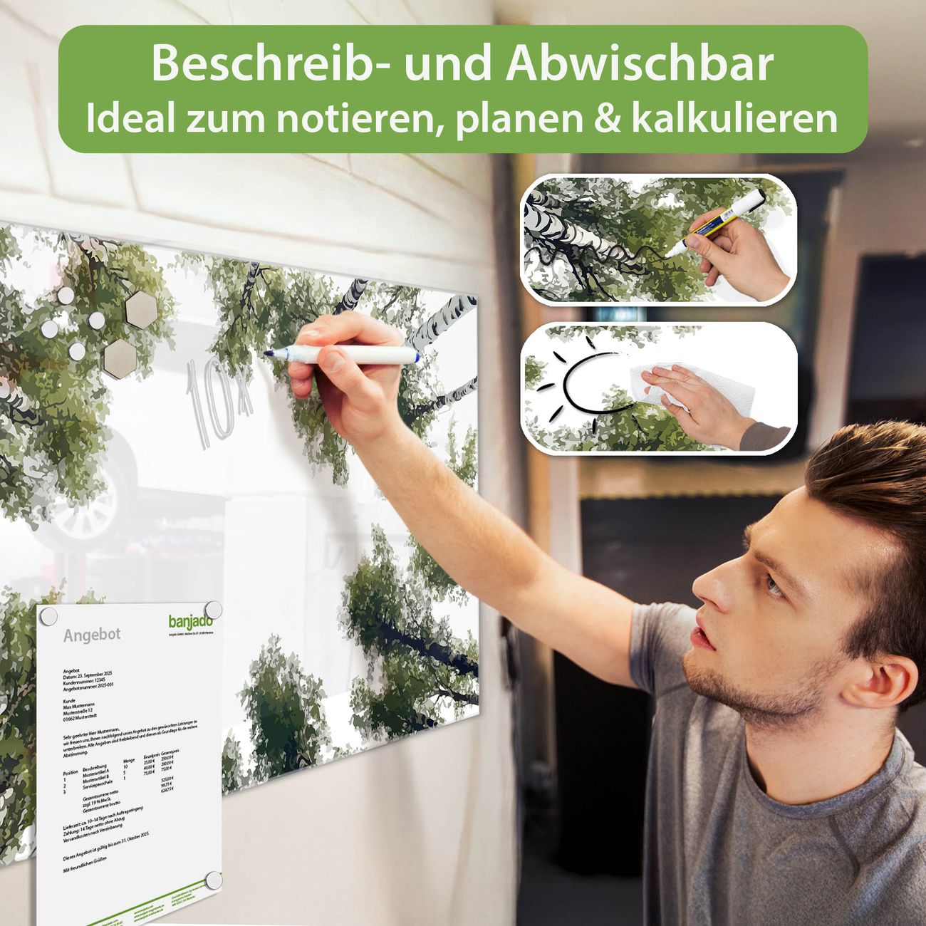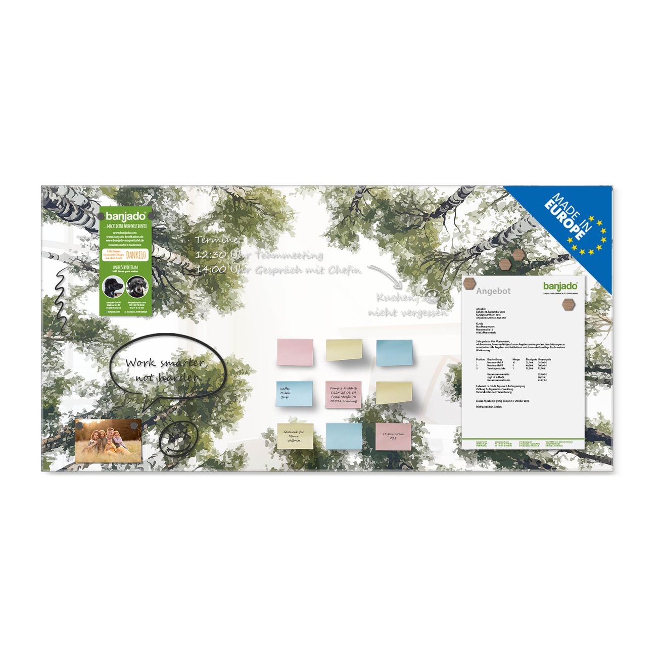 Material: 4mm Sicherheitsglas mit Metallrückwand Eigenschaften: beschreibbar, magnetisch, kratzfest Maße: 100x50x0,6cm, 7,50kg schwer Motiv Nummer 13504 Waldhimmel Zubehör: inklusive 4 Neodym-Magnete