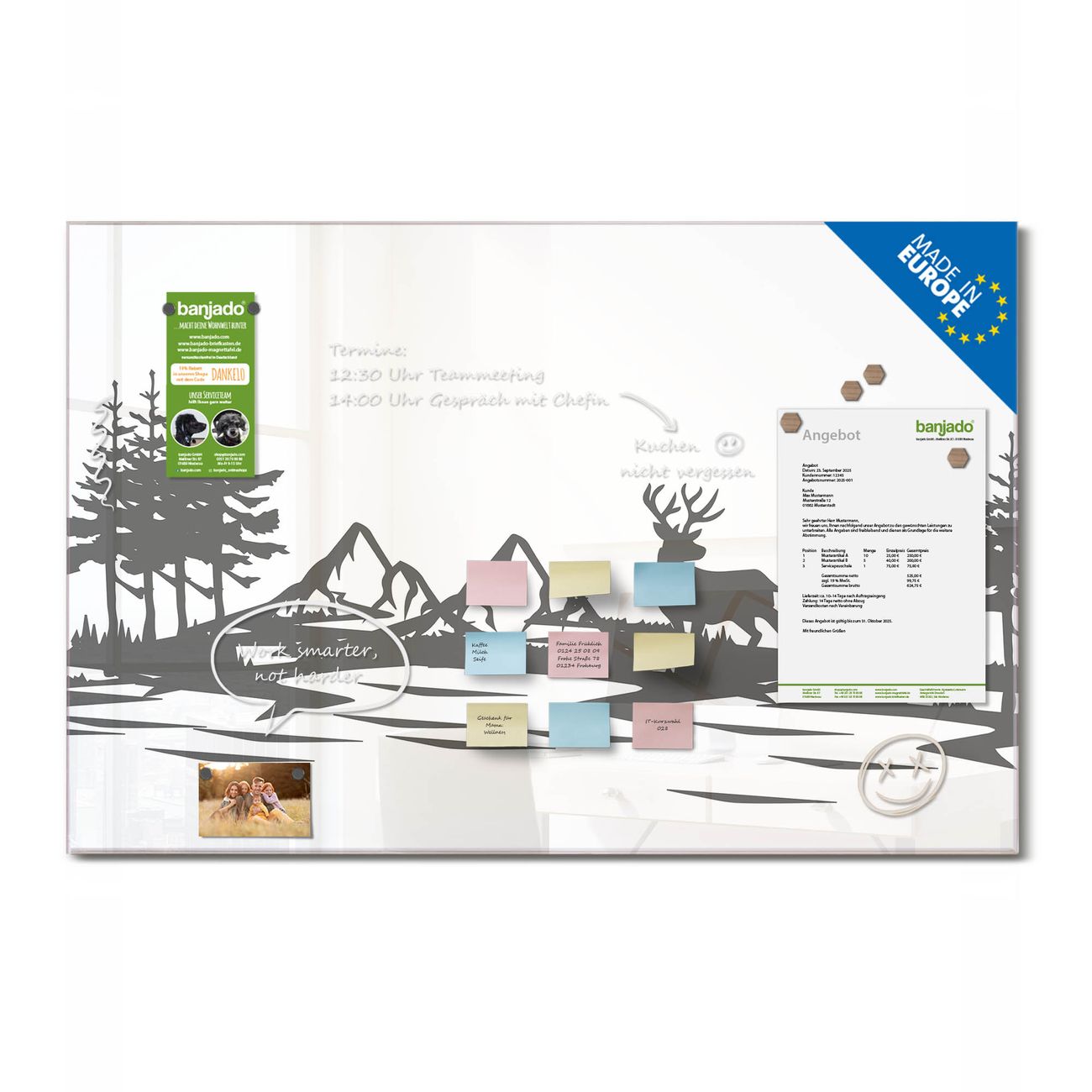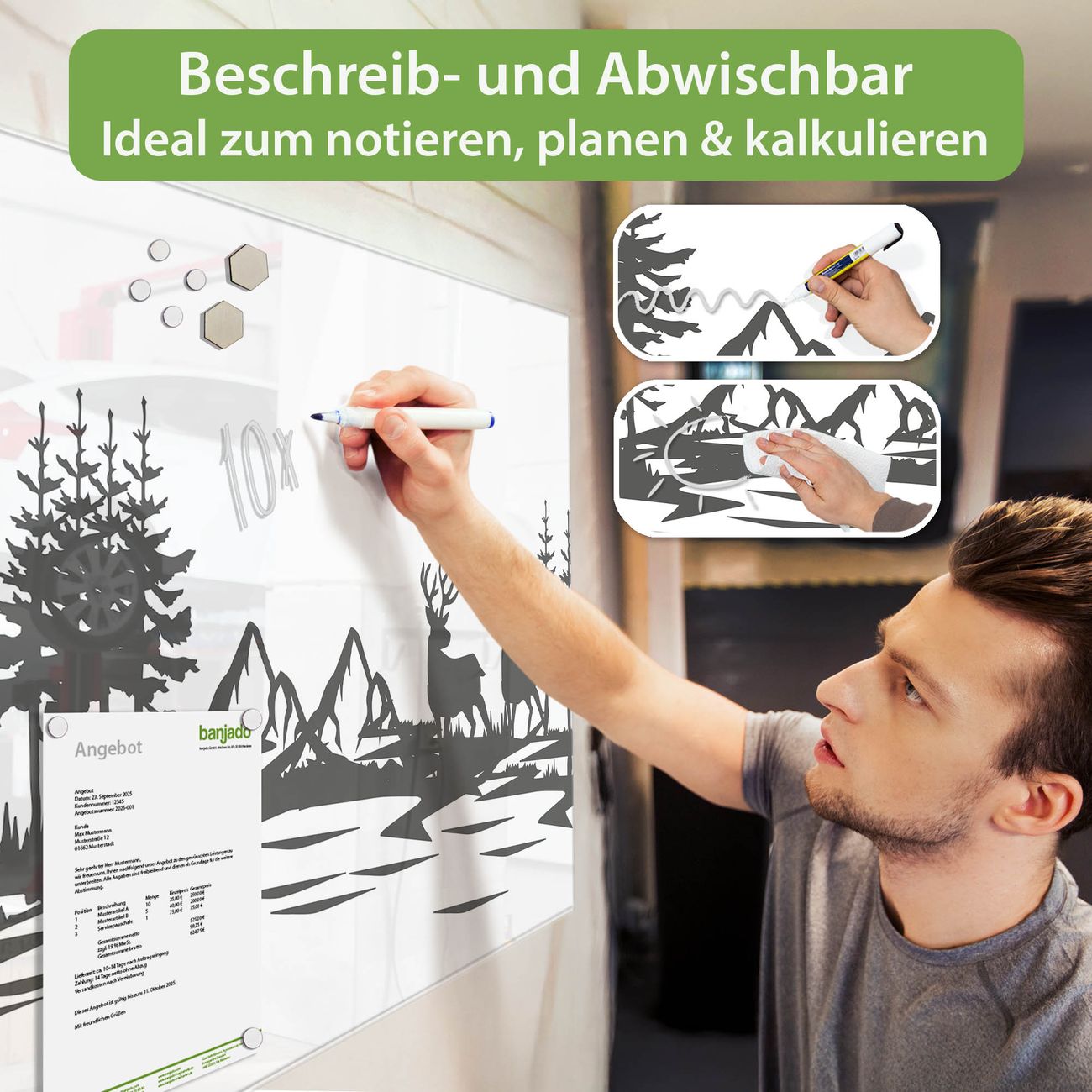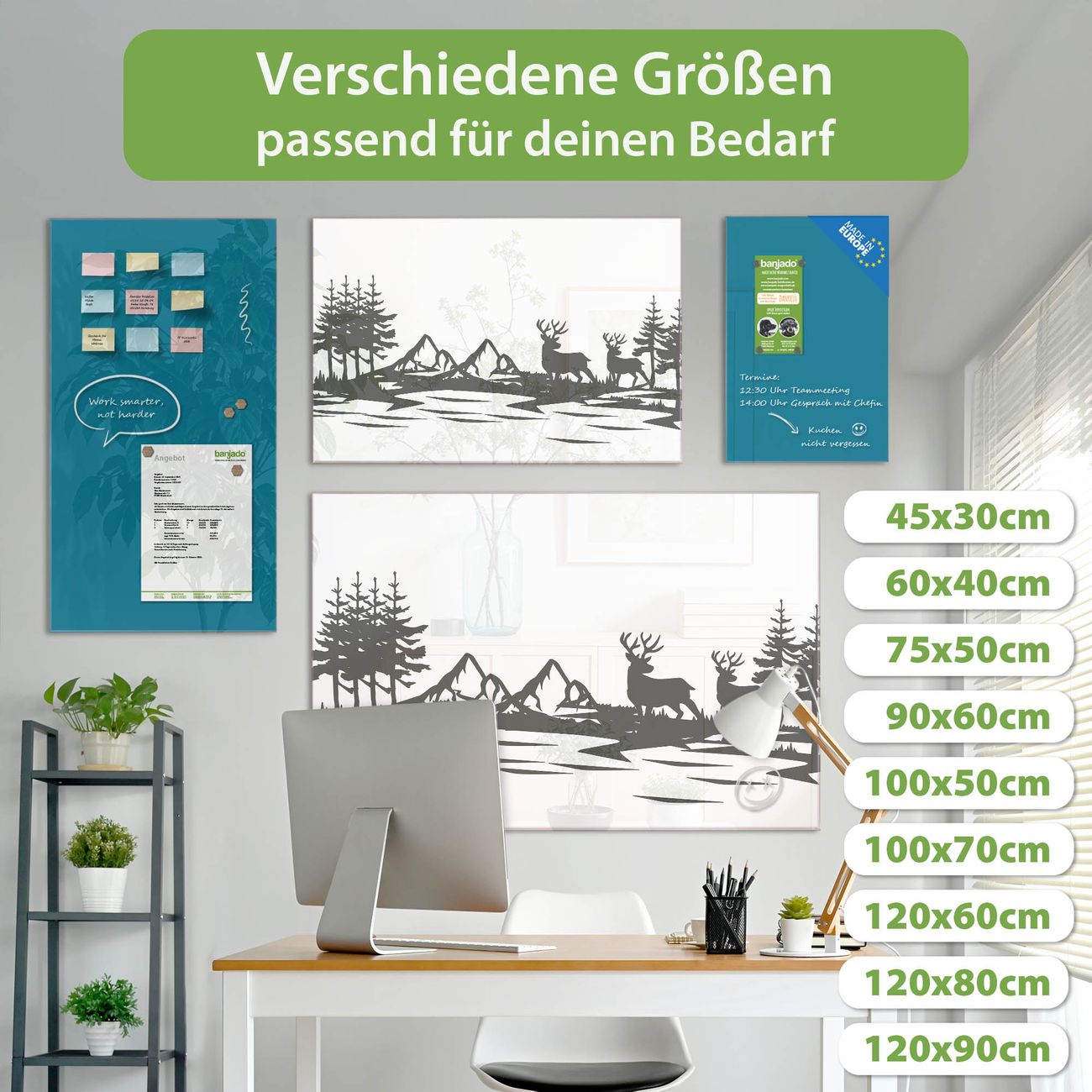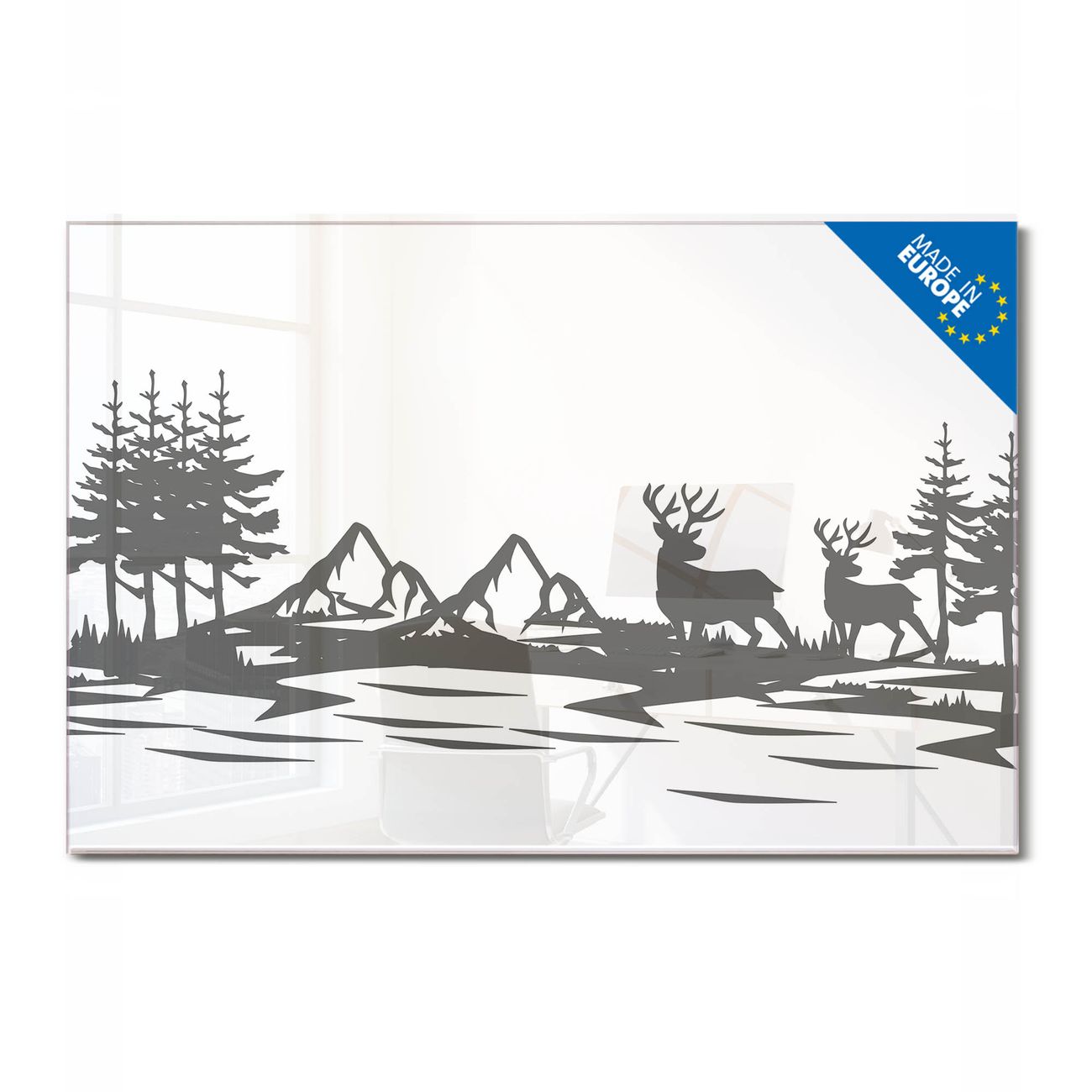 Material: 4mm Sicherheitsglas mit Metallrückwand Eigenschaften: beschreibbar, magnetisch, kratzfest Maße: 120x80x0,6cm, 14,40kg schwer Motiv Nummer 13348 Waldidylle mit Hirschen Zubehör: inklusive 4 Neodym-Magnete