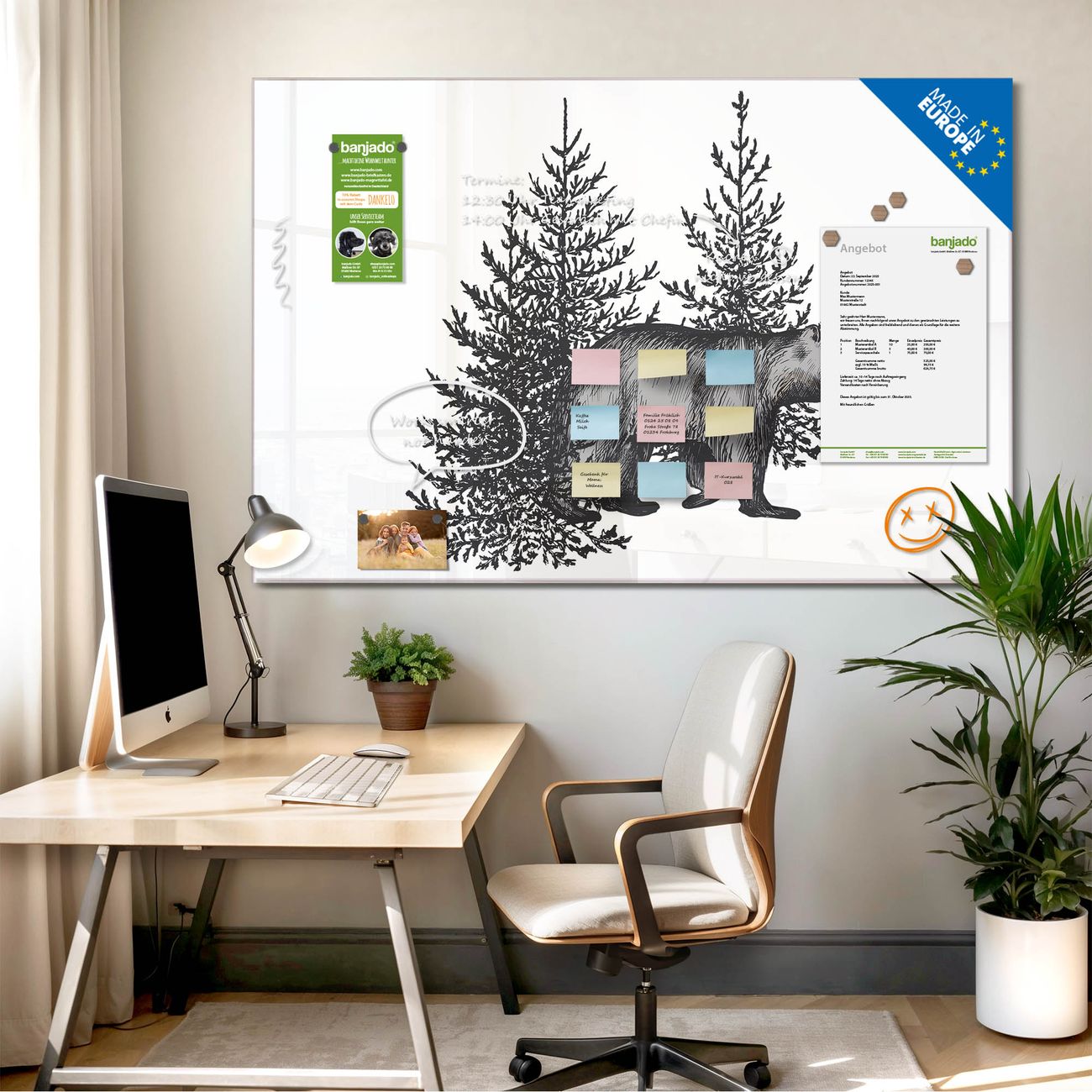 Die banjado Glas Magnettafel mit dem Motiv Motiv Waldspaziergang mit Bär verbindet Funktionalität mit Stil. Sie ersetzt das Zettelchaos durch klare Strukturen und bringt dabei eine warme, natürliche Atmosphäre in Ihr Zuhause. Ob im Büro, in der Küche oder im Eingangsbereich - dieses Design-Board zieht Blicke an und sorgt für Ordnung mit Charakter.