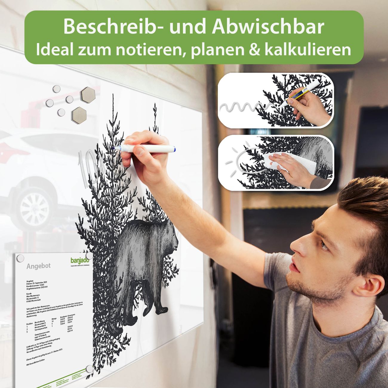Jede Glas Magnettafel wird in unserer Werkstatt von Hand gefertigt und sorgfältig geprüft. So erhalten Sie ein echtes Qualitätsprodukt, das Funktion und Ästhetik perfekt vereint.?? Warum banjado?