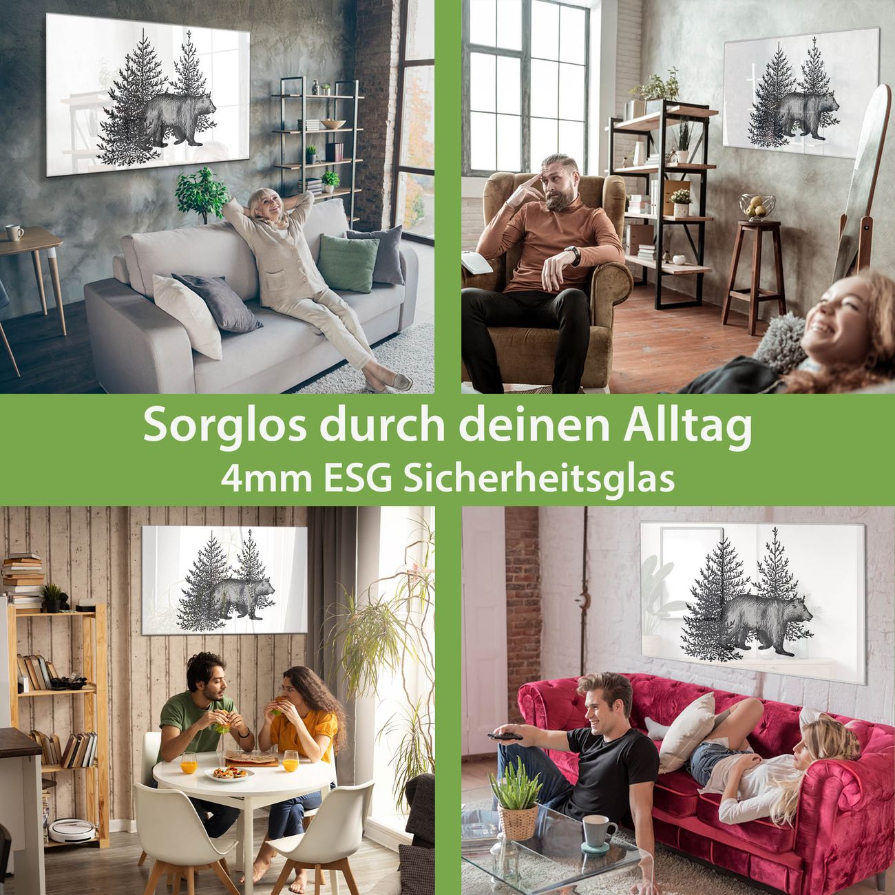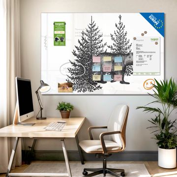 Material: 4mm Sicherheitsglas mit Metallrückwand Eigenschaften: beschreibbar, magnetisch, kratzfest Maße: 75x50x0,6cm, 5,63kg schwer Motiv Nummer 13484 Waldspaziergang mit Bär Zubehör: inklusive 4 Neodym-Magnete