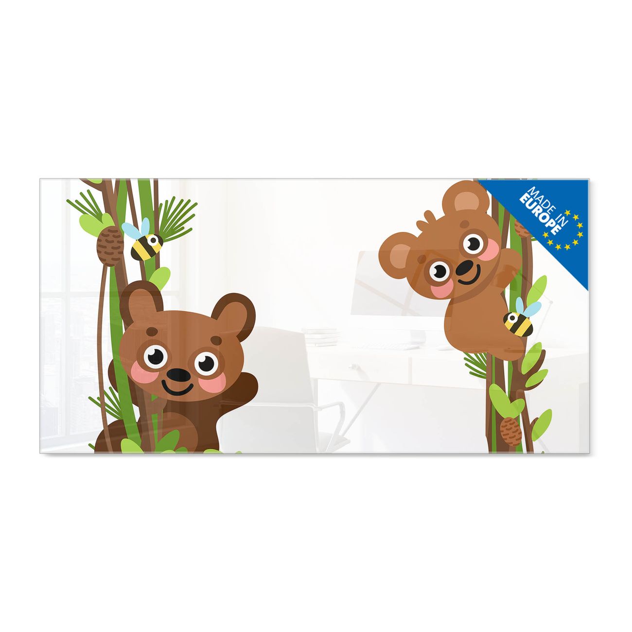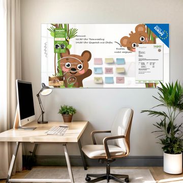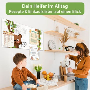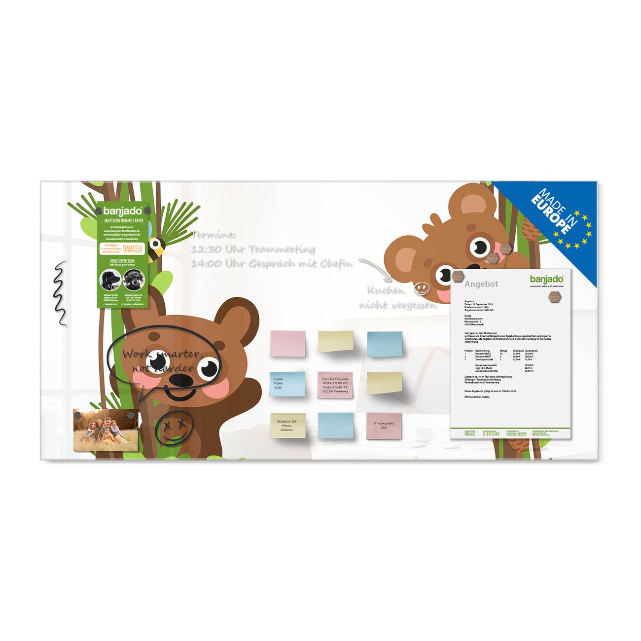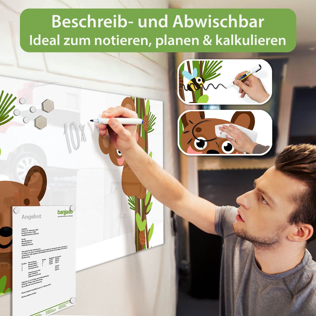 Material: 4mm Sicherheitsglas mit Metallrückwand Eigenschaften: beschreibbar, magnetisch, kratzfest Maße: 100x50x0,6cm, 7,50kg schwer Motiv Nummer 13256 Waldtier-Rahmen Zubehör: inklusive 4 Neodym-Magnete