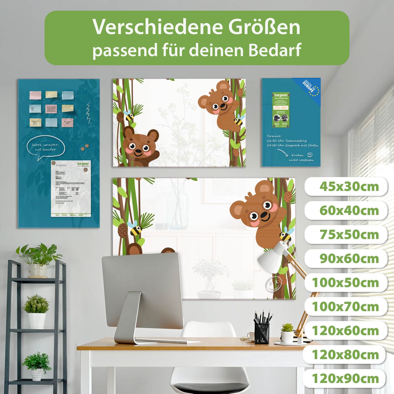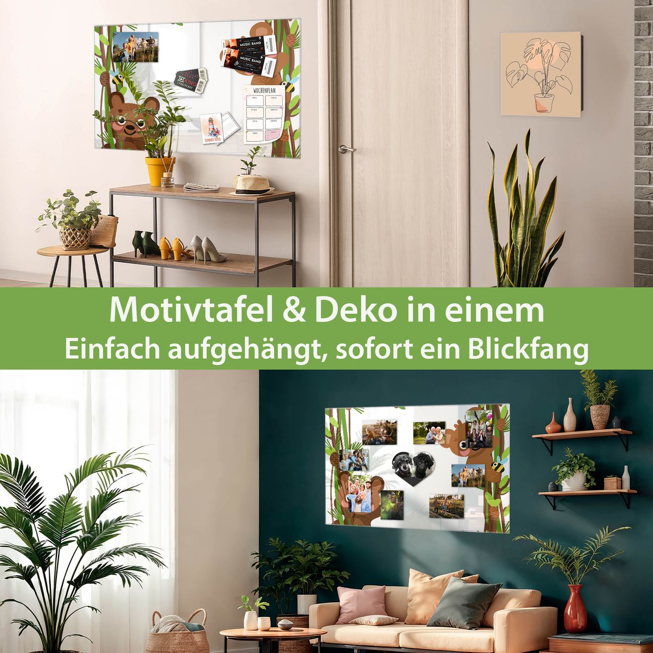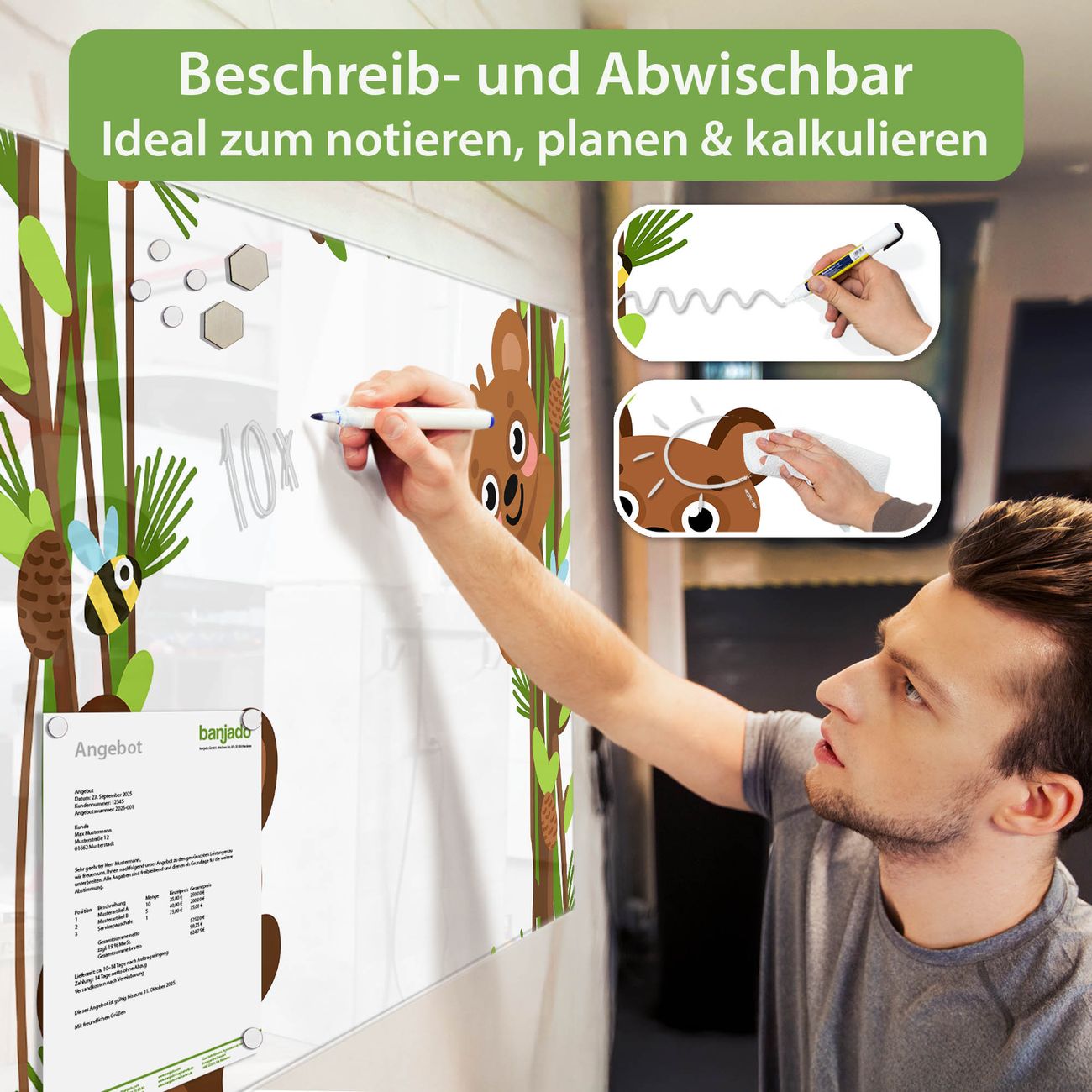 Material: 4mm Sicherheitsglas mit Metallrückwand Eigenschaften: beschreibbar, magnetisch, kratzfest Maße: 120x80x0,6cm, 14,40kg schwer Motiv Nummer 13256 Waldtier-Rahmen Zubehör: inklusive 4 Neodym-Magnete