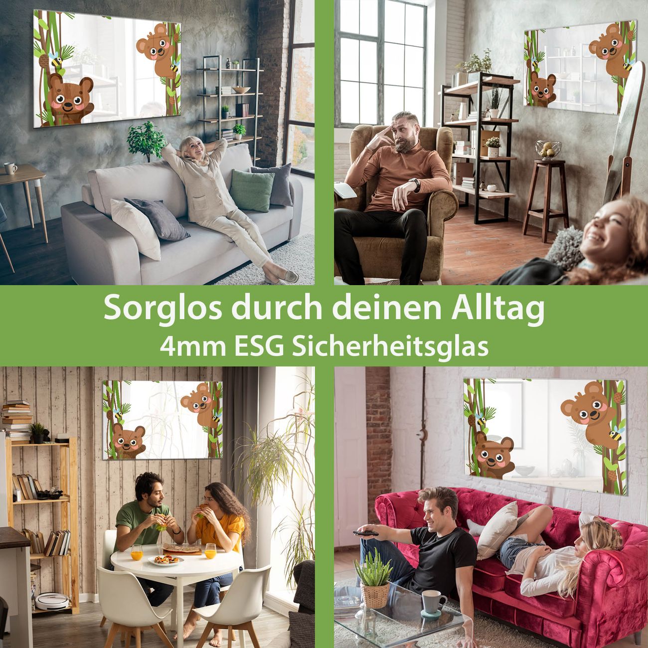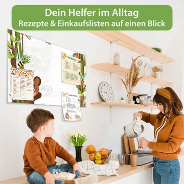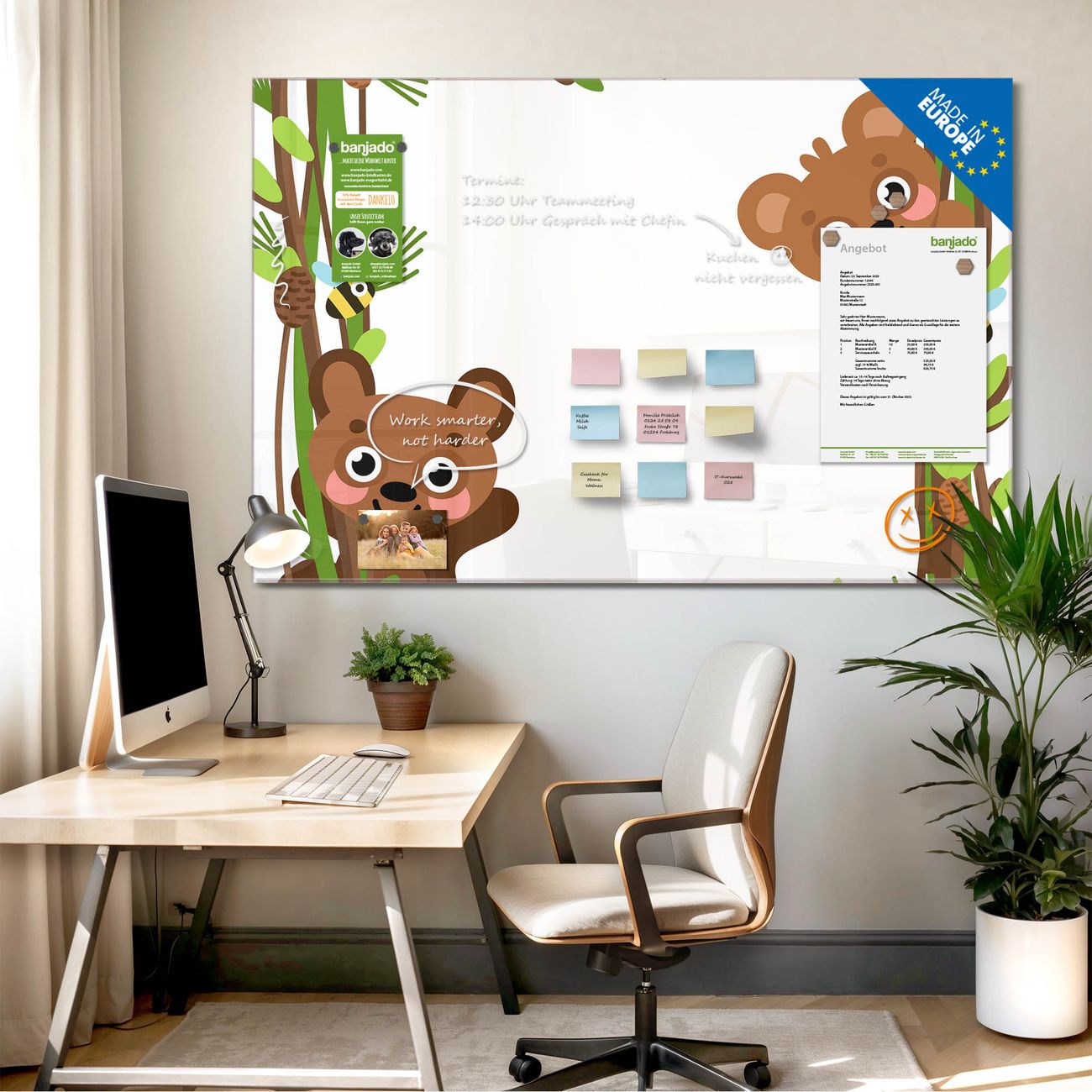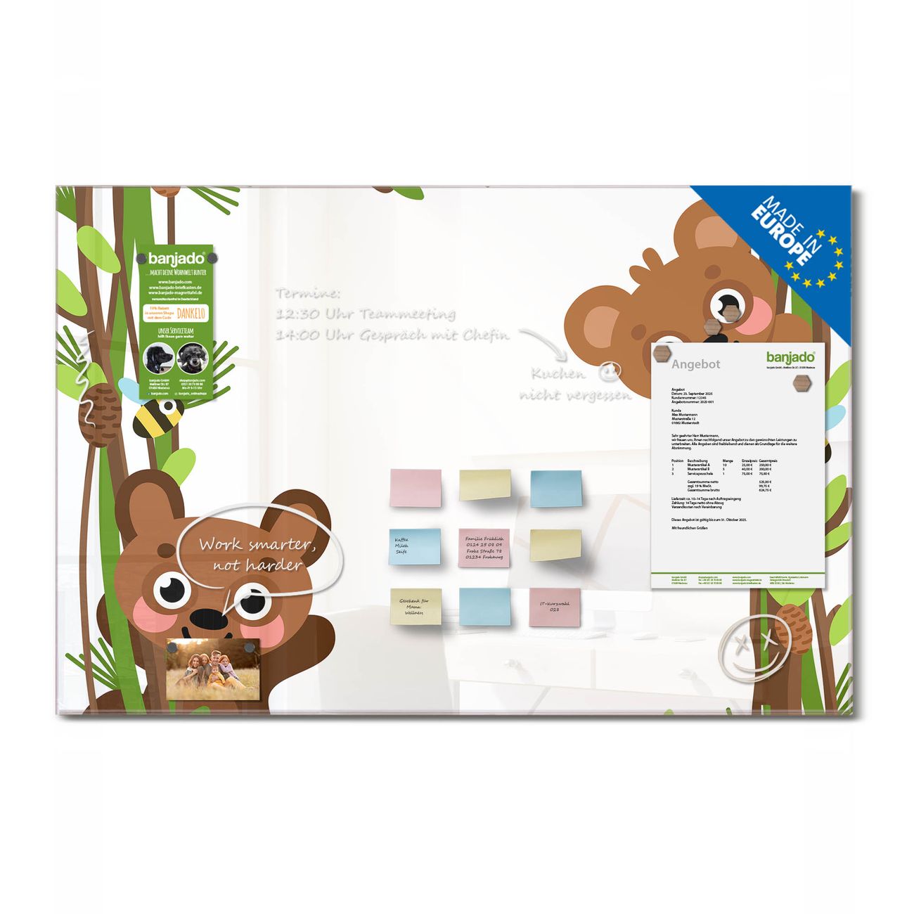 Material: 4mm Sicherheitsglas mit Metallrückwand Eigenschaften: beschreibbar, magnetisch, kratzfest Maße: 120x80x0,6cm, 14,40kg schwer Motiv Nummer 13256 Waldtier-Rahmen Zubehör: inklusive 4 Neodym-Magnete