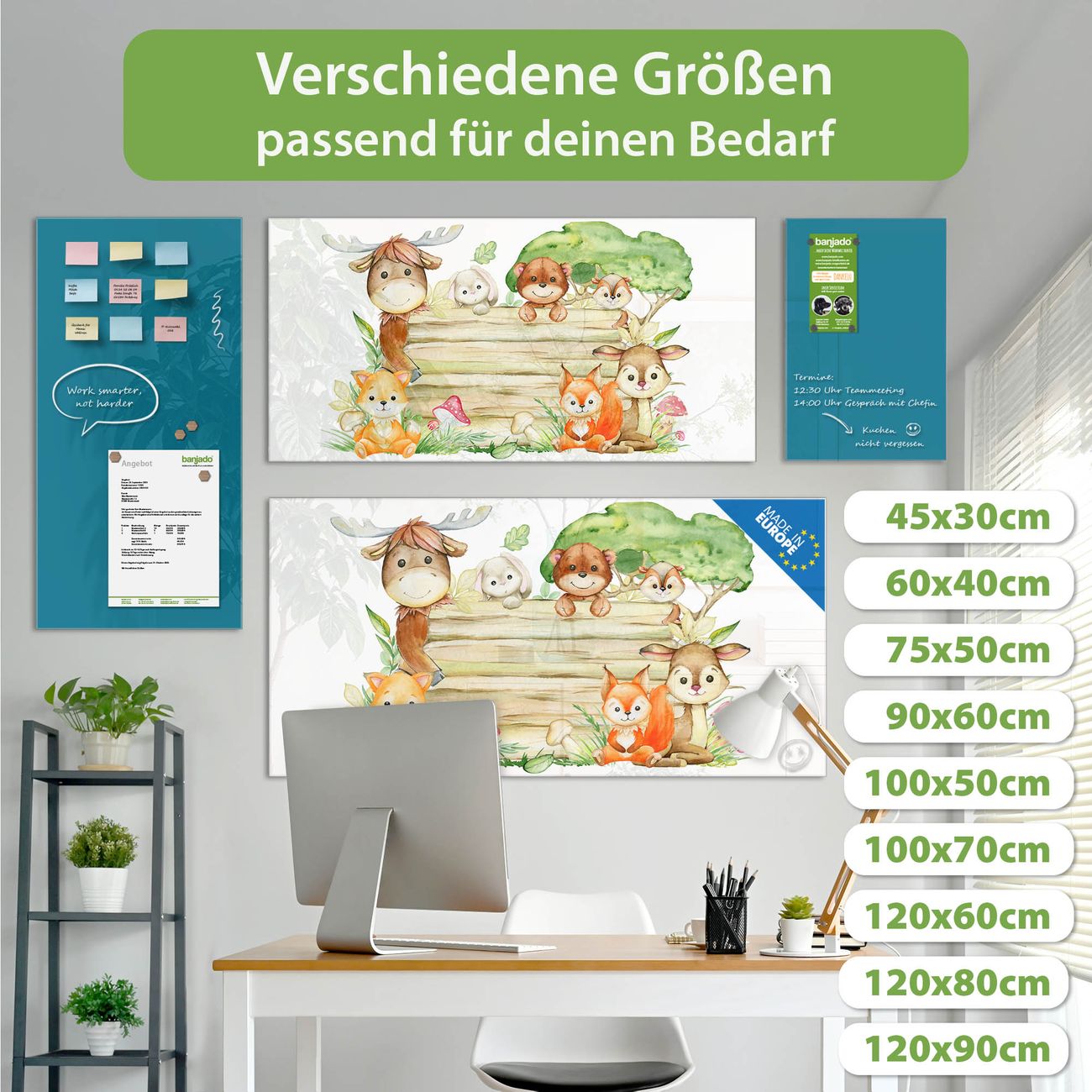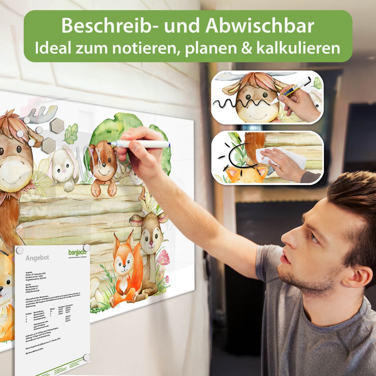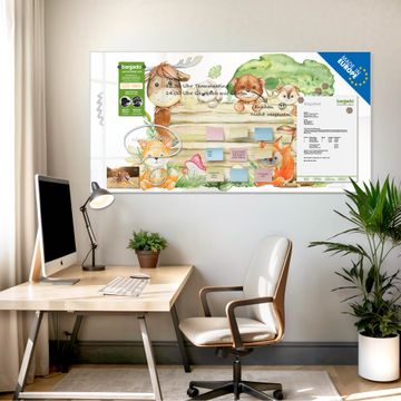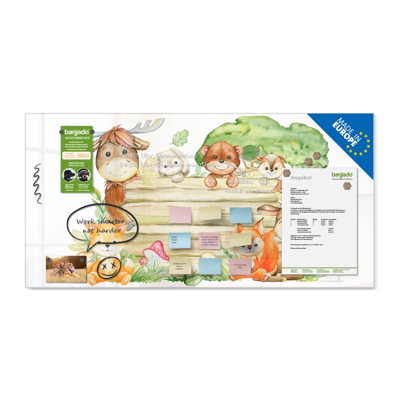 Material: 4mm Sicherheitsglas mit Metallrückwand Eigenschaften: beschreibbar, magnetisch, kratzfest Maße: 100x50x0,6cm, 7,50kg schwer Motiv Nummer 13252 Waldtiere Abenteuer Zubehör: inklusive 4 Neodym-Magnete