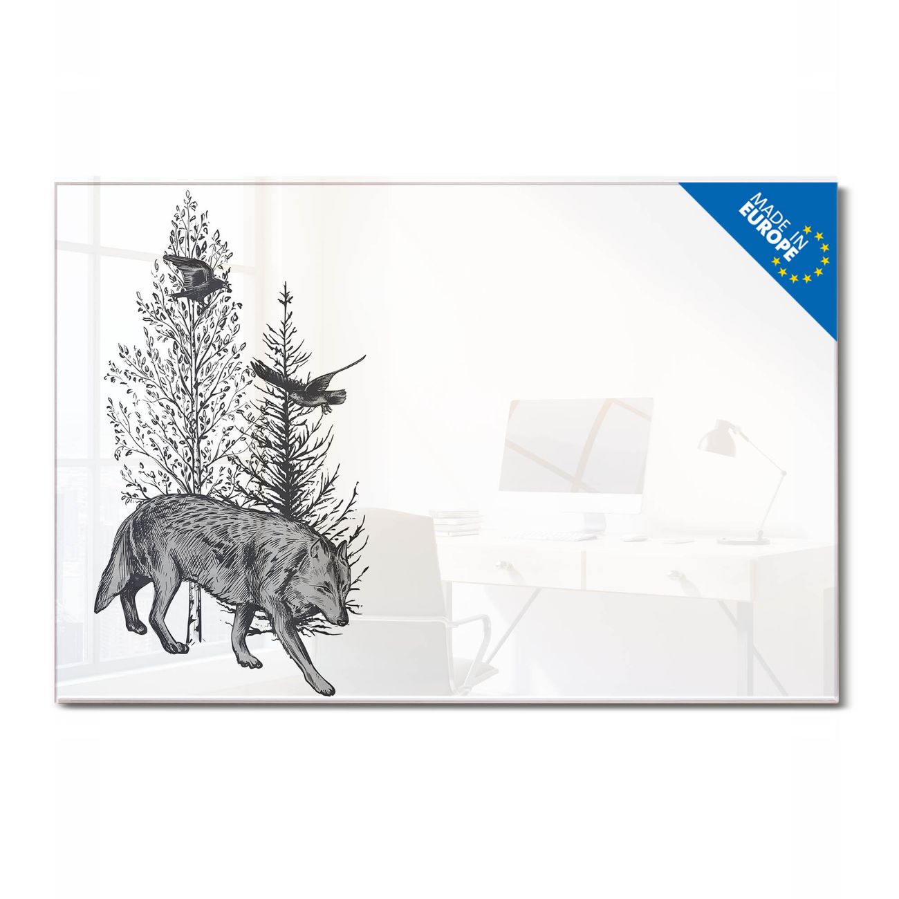 Material: 4mm Sicherheitsglas mit Metallrückwand Eigenschaften: beschreibbar, magnetisch, kratzfest Maße: 75x50x0,6cm, 5,63kg schwer Motiv Nummer 13482 Waldtiere in Schwarz-Weiß Zubehör: inklusive 4 Neodym-Magnete