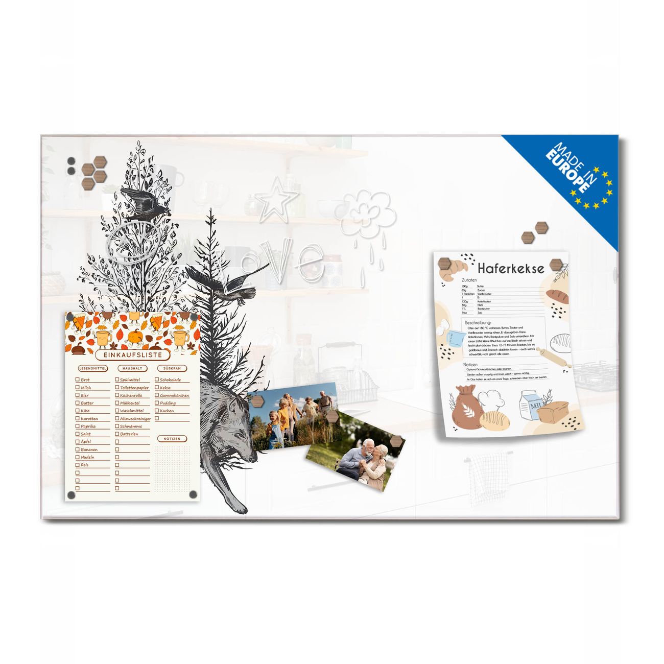 Ein Stück Design, das Ihren Alltag organisiert. Schreiben, heften, inspirieren - alles an einem Ort. Qualität, die man spürt. Montage leicht gemacht. Handwerk mit Herz - veredelt in Sachsen. Einzigartiges Design mit Motiv Motiv Waldtiere in Schwarz-Weiß Beschreibbare Glasoberfläche, leicht zu reinigen Starke Magnetkraft durch Stahlrückwand Inklusive 4 Neodym-Magneten Flexible Montageoptionen Handveredelt in Sachsen - Qualität, die bleibt