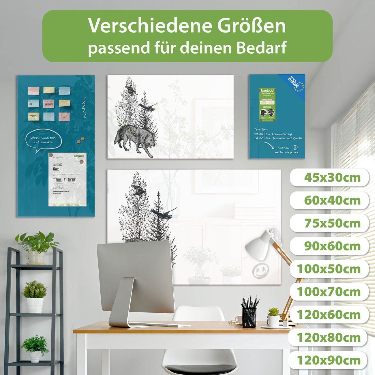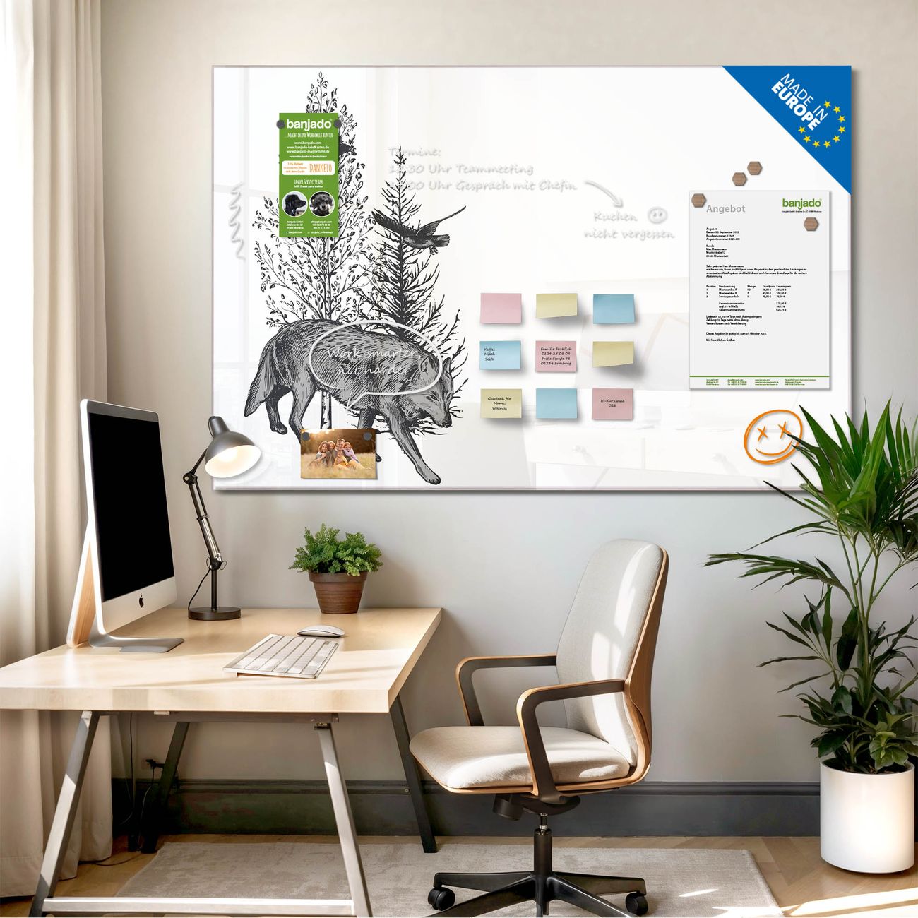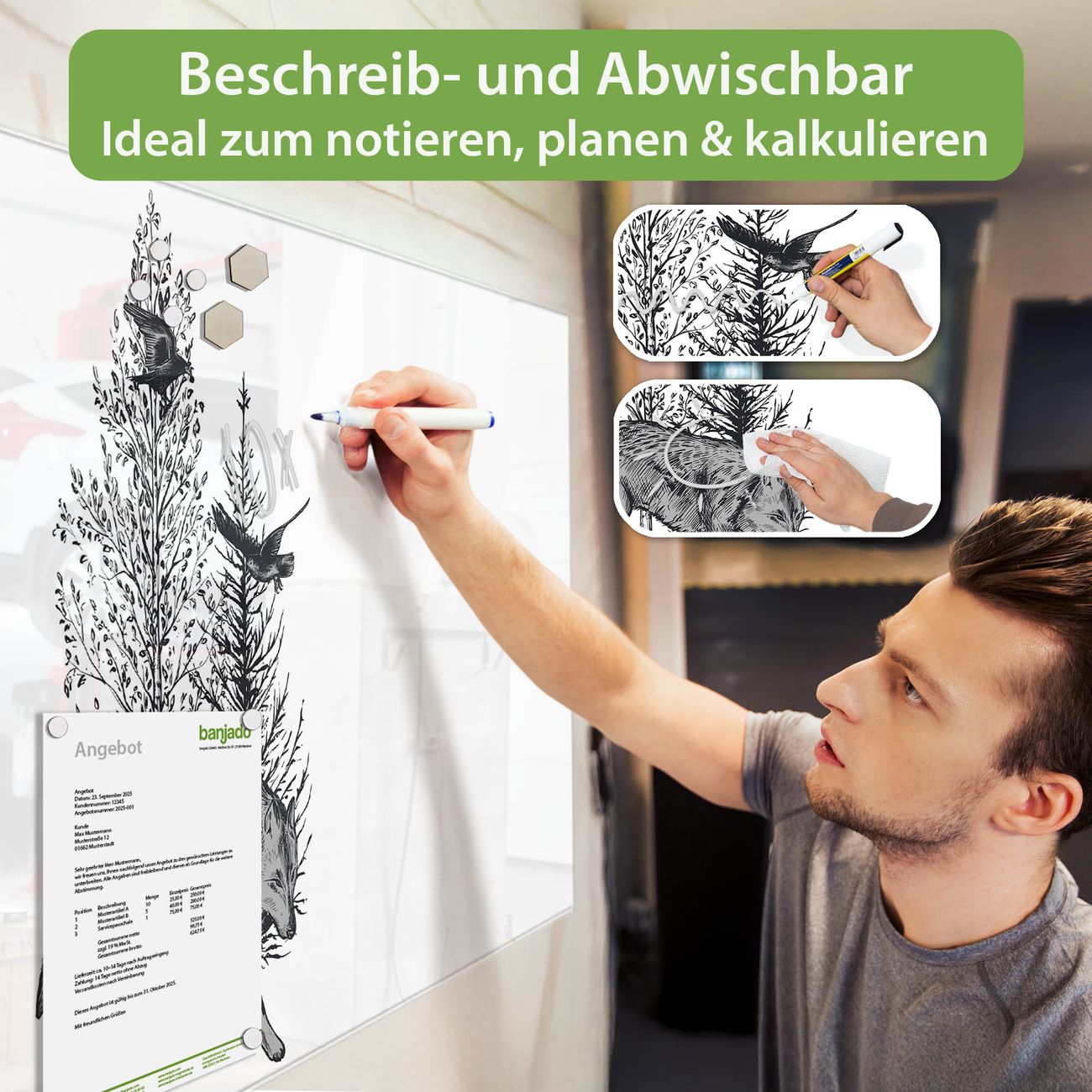 Jede Glas Magnettafel wird in unserer Werkstatt von Hand gefertigt und sorgfältig geprüft. So erhalten Sie ein echtes Qualitätsprodukt, das Funktion und Ästhetik perfekt vereint.?? Warum banjado?