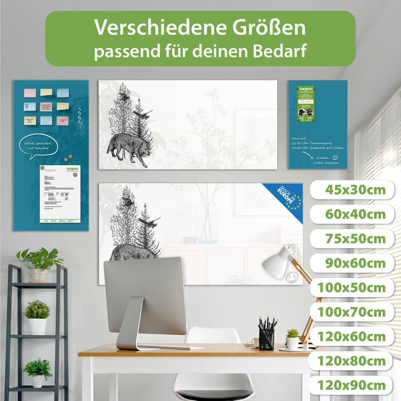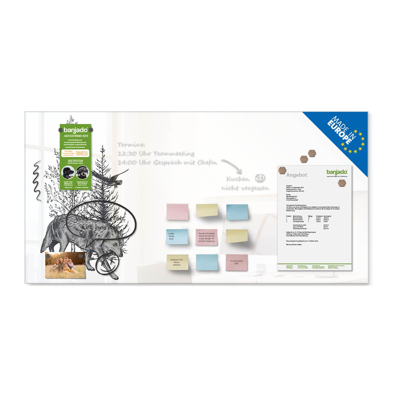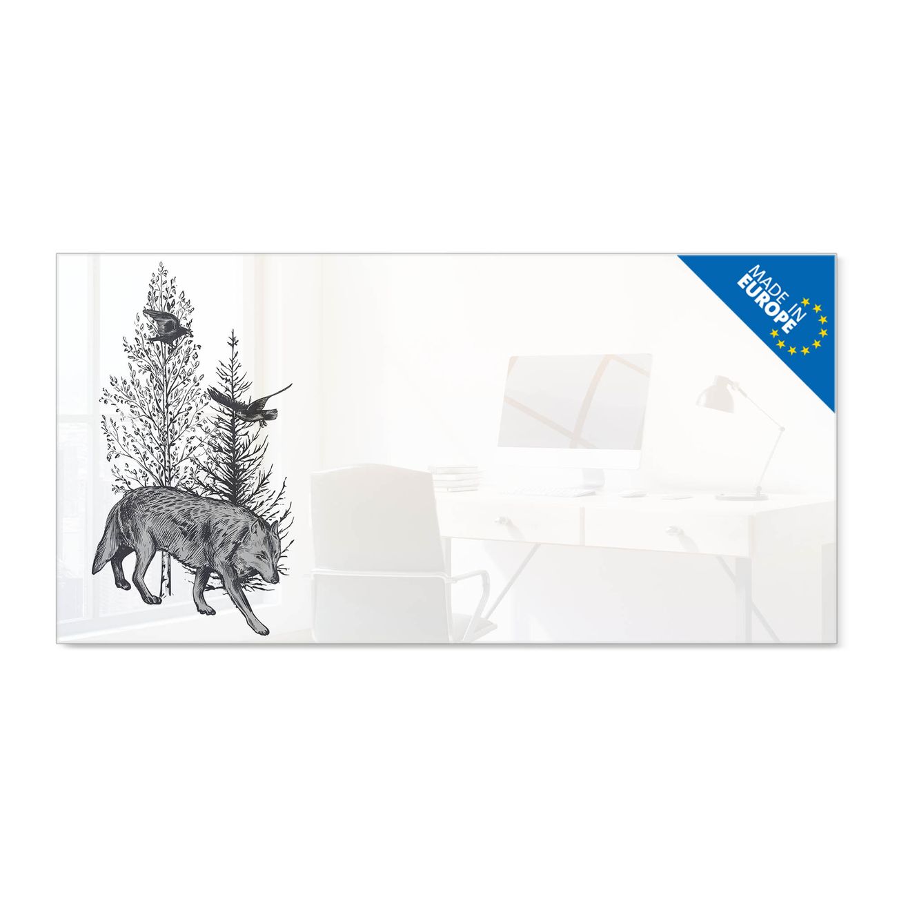 Material: 4mm Sicherheitsglas mit Metallrückwand Eigenschaften: beschreibbar, magnetisch, kratzfest Maße: 100x50x0,6cm, 7,50kg schwer Motiv Nummer 13482 Waldtiere in Schwarz-Weiß Zubehör: inklusive 4 Neodym-Magnete