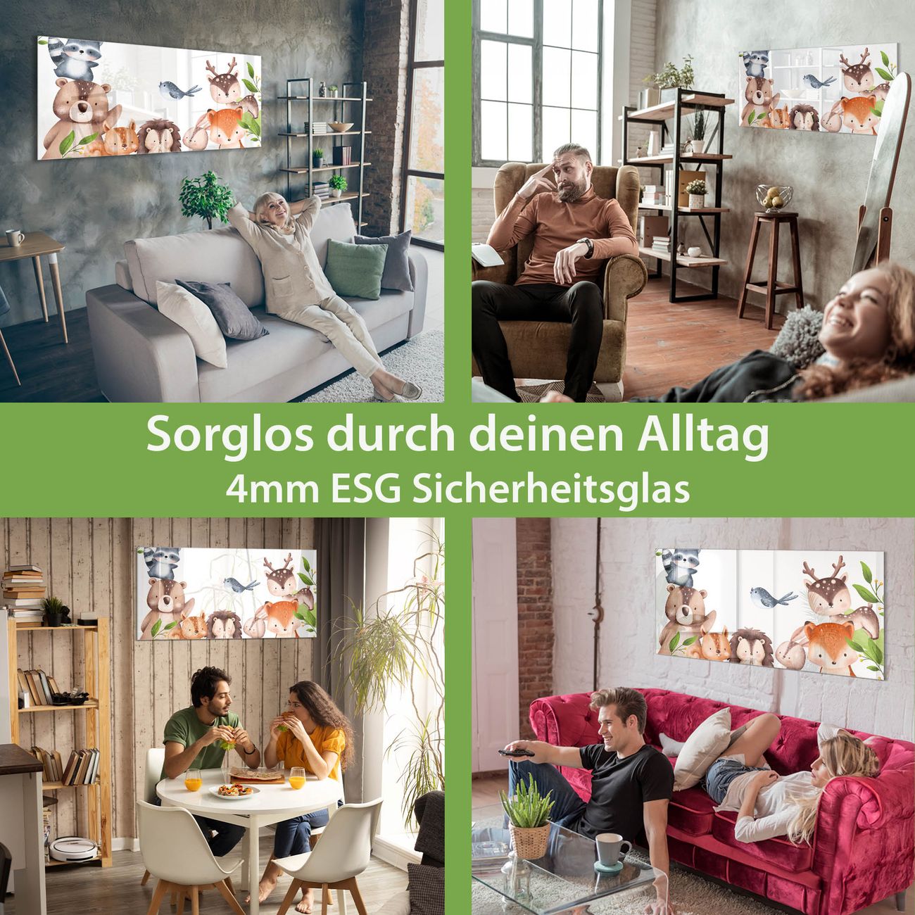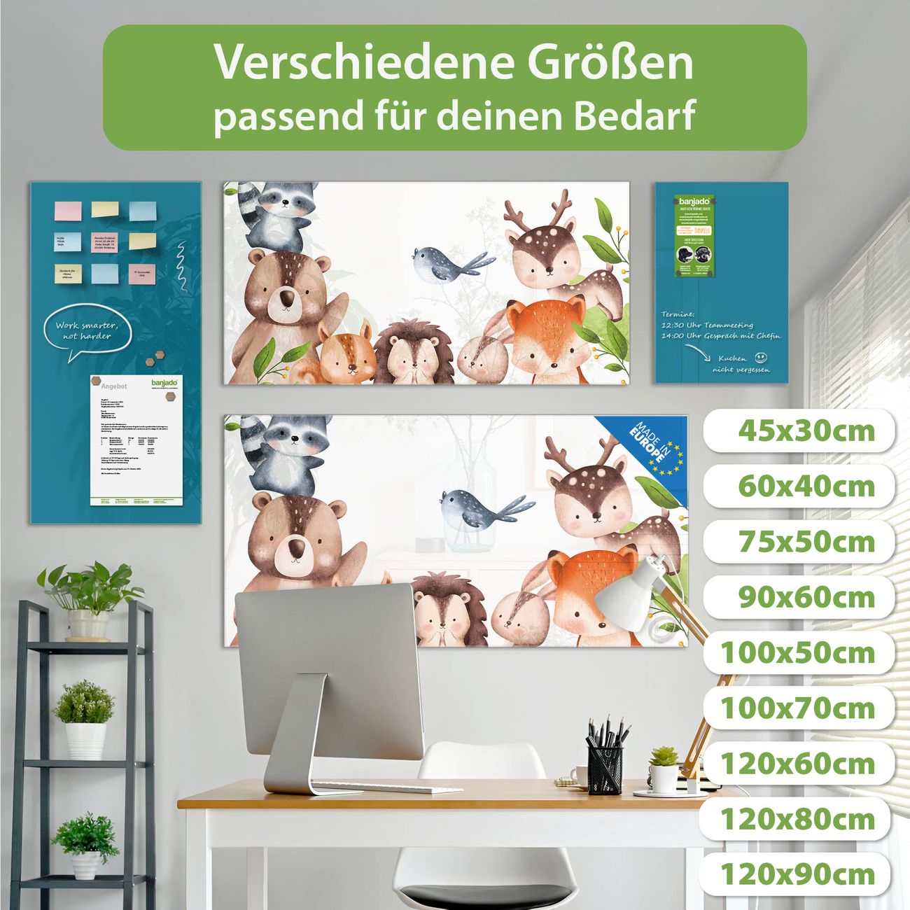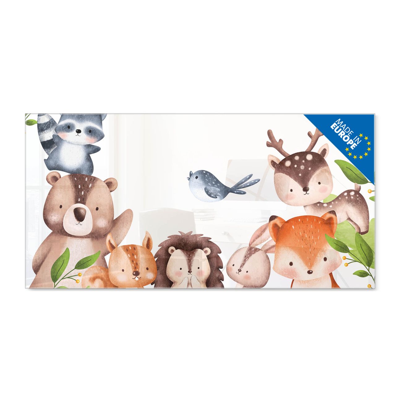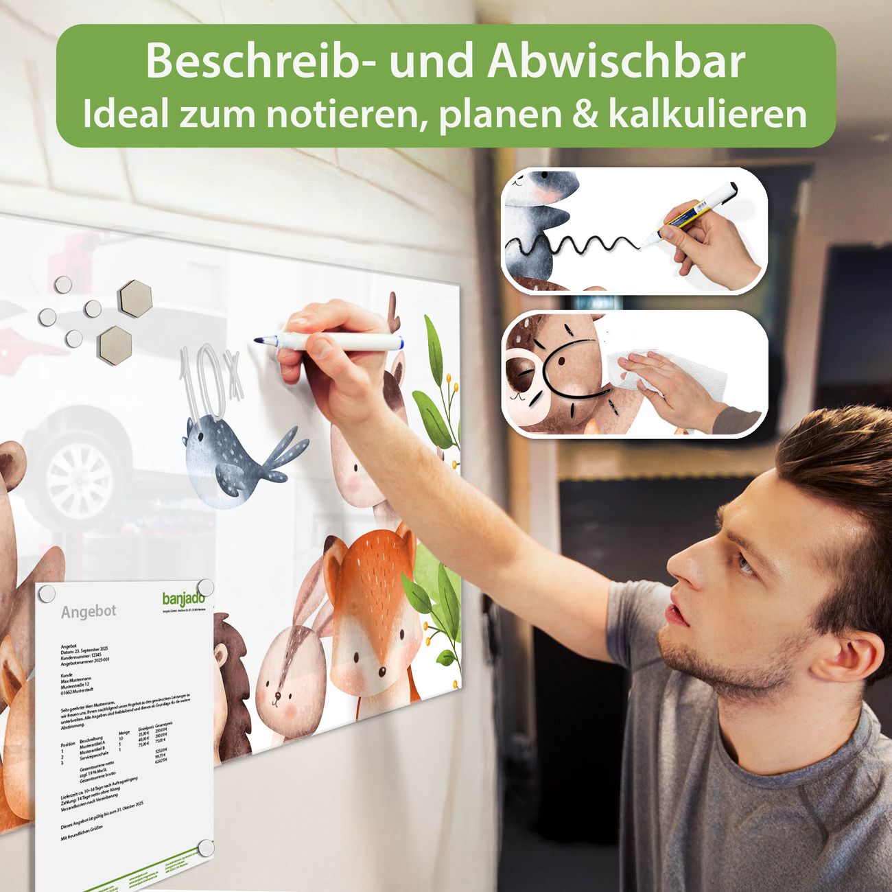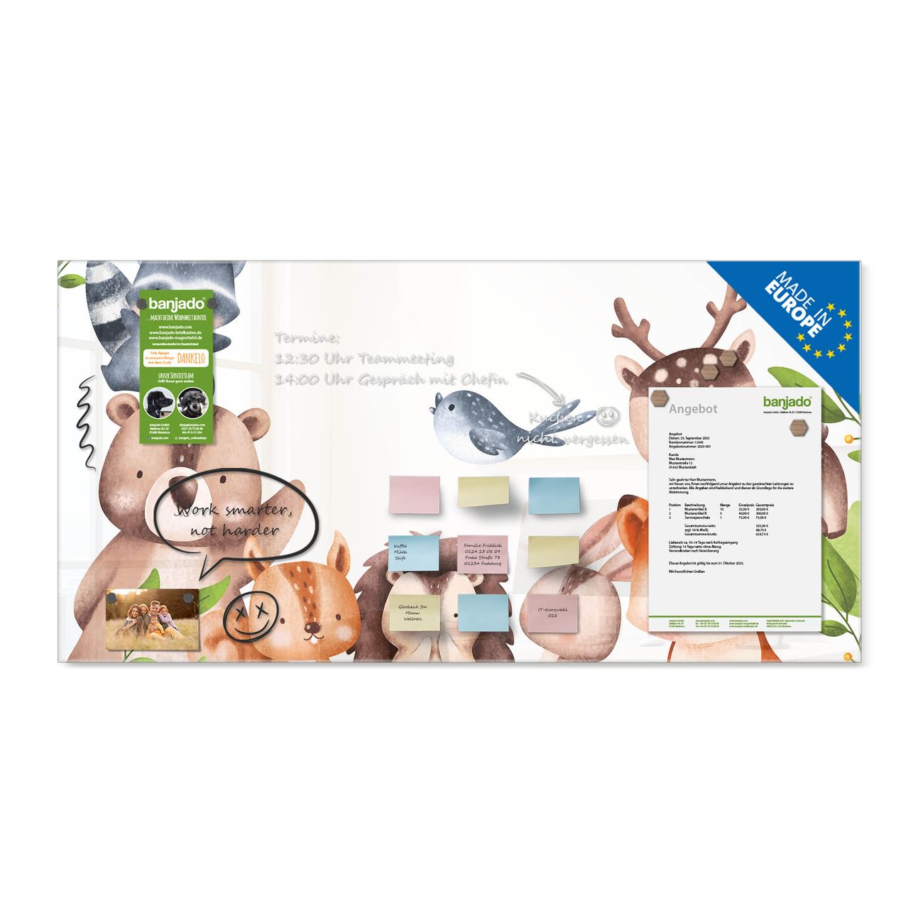 Material: 4mm Sicherheitsglas mit Metallrückwand Eigenschaften: beschreibbar, magnetisch, kratzfest Maße: 100x50x0,6cm, 7,50kg schwer Motiv Nummer 13267 Waldtierfreunde 2 Zubehör: inklusive 4 Neodym-Magnete