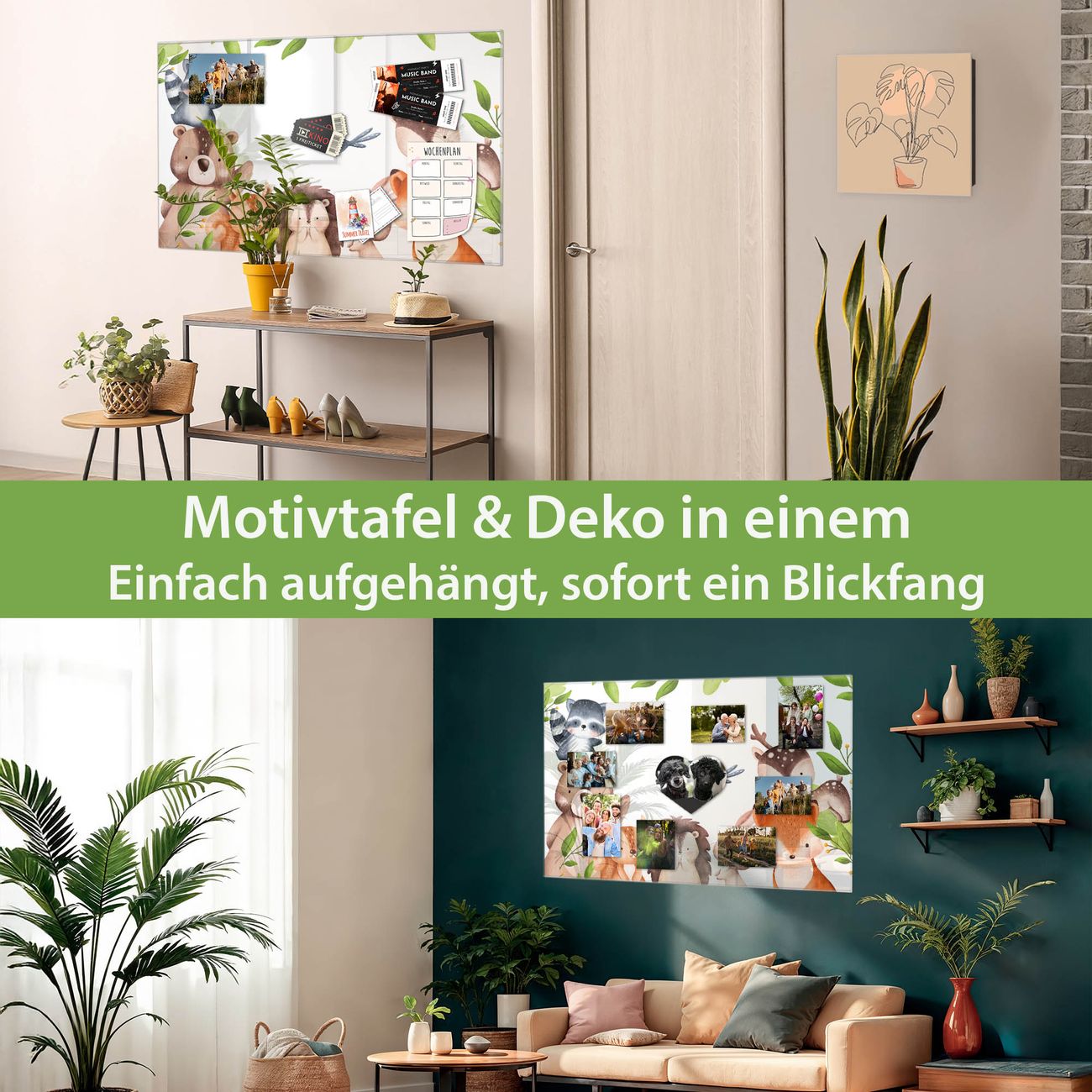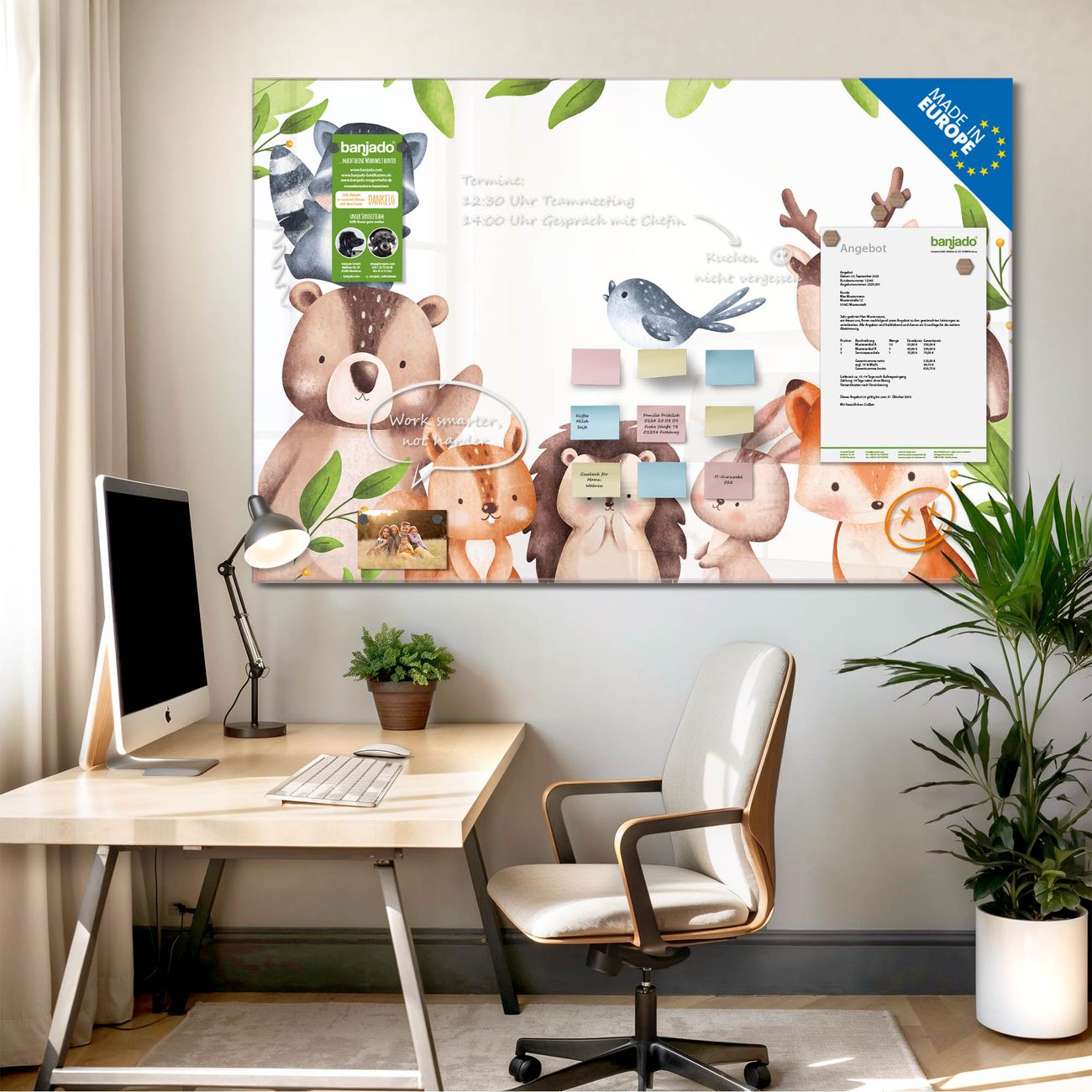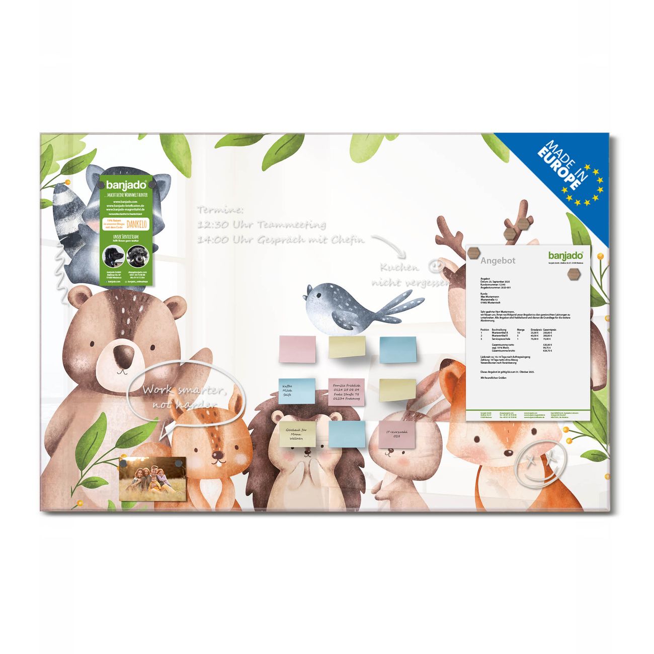 Material: 4mm Sicherheitsglas mit Metallrückwand Eigenschaften: beschreibbar, magnetisch, kratzfest Maße: 120x80x0,6cm, 14,40kg schwer Motiv Nummer 13267 Waldtierfreunde 2 Zubehör: inklusive 4 Neodym-Magnete