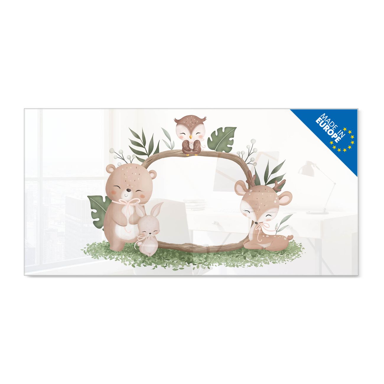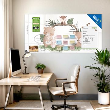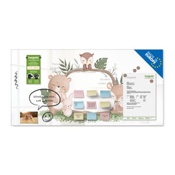 Material: 4mm Sicherheitsglas mit Metallrückwand Eigenschaften: beschreibbar, magnetisch, kratzfest Maße: 100x50x0,6cm, 7,50kg schwer Motiv Nummer 13265 Waldtierfreunde Zubehör: inklusive 4 Neodym-Magnete
