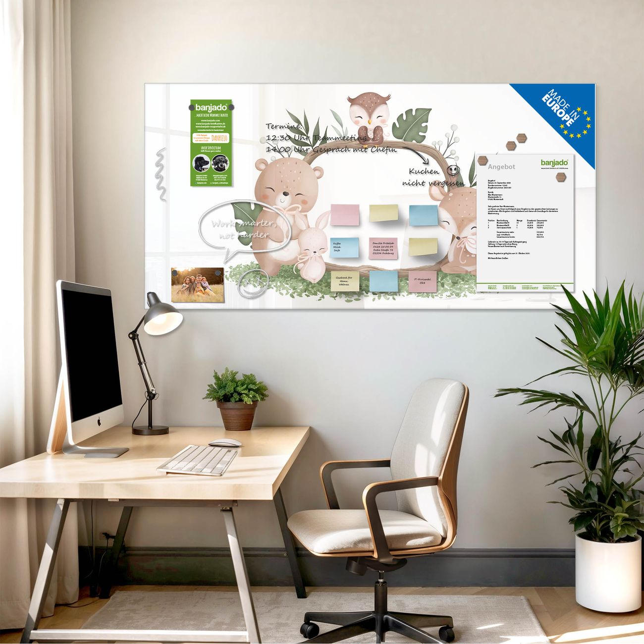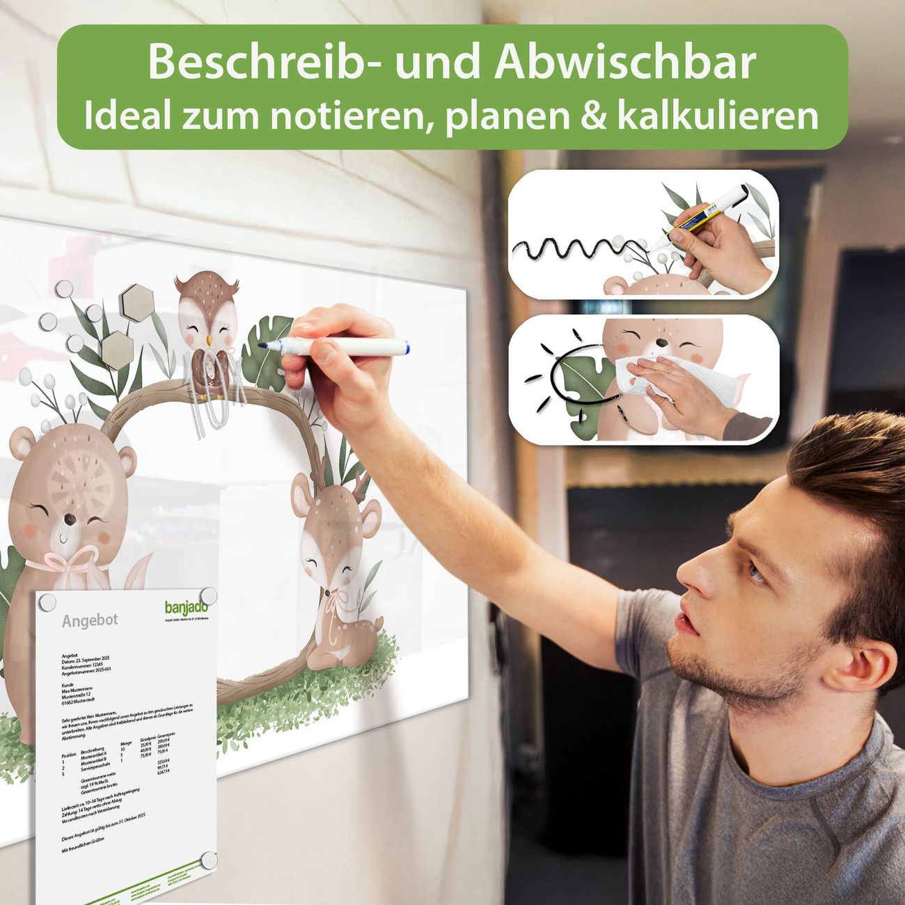 Jede Glas Magnettafel wird in unserer Werkstatt von Hand gefertigt und sorgfältig geprüft. So erhalten Sie ein echtes Qualitätsprodukt, das Funktion und Ästhetik perfekt vereint.?? Warum banjado?