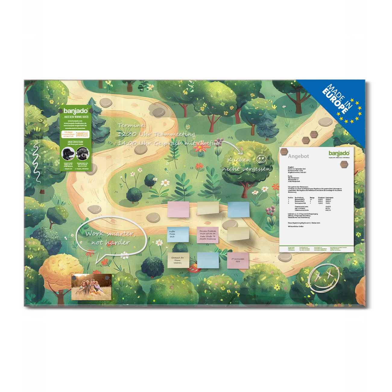 Material: 4mm Sicherheitsglas mit Metallrückwand Eigenschaften: beschreibbar, magnetisch, kratzfest Maße: 120x80x0,6cm, 14,40kg schwer Motiv Nummer 13012 Waldweg Zubehör: inklusive 4 Neodym-Magnete