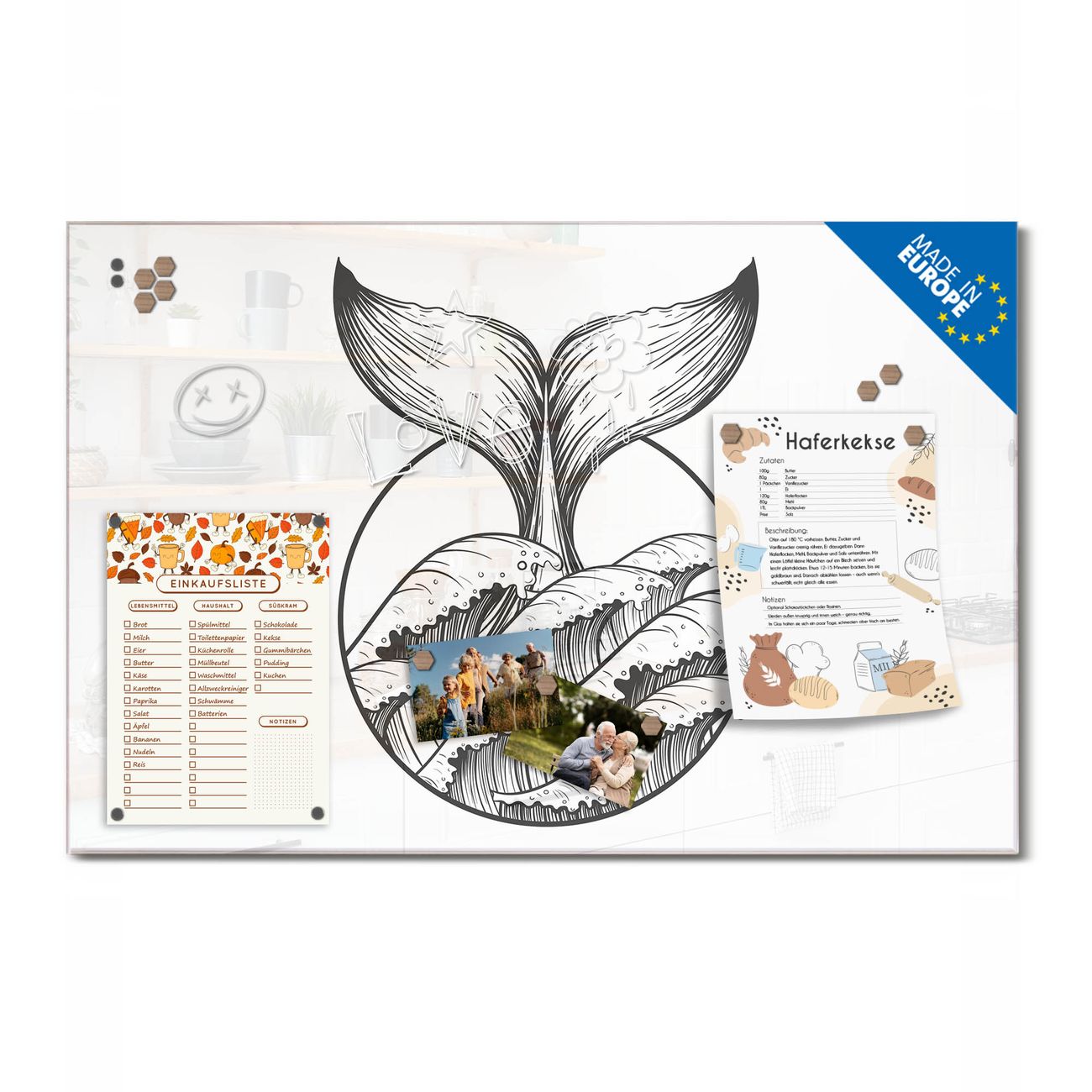 Ein Stück Design, das Ihren Alltag organisiert. Schreiben, heften, inspirieren - alles an einem Ort. Qualität, die man spürt. Montage leicht gemacht. Handwerk mit Herz - veredelt in Sachsen. Einzigartiges Design mit Motiv Motiv Walflosse und Welle 2 Beschreibbare Glasoberfläche, leicht zu reinigen Starke Magnetkraft durch Stahlrückwand Inklusive 4 Neodym-Magneten Flexible Montageoptionen Handveredelt in Sachsen - Qualität, die bleibt