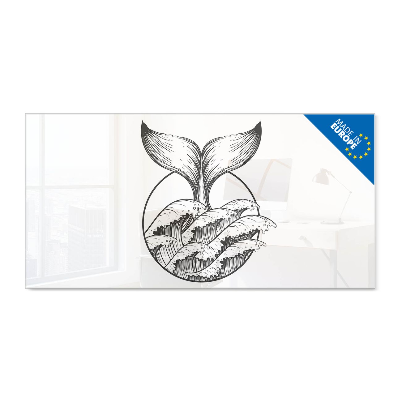 Material: 4mm Sicherheitsglas mit Metallrückwand Eigenschaften: beschreibbar, magnetisch, kratzfest Maße: 100x50x0,6cm, 7,50kg schwer Motiv Nummer 13032 Walflosse und Welle 2 Zubehör: inklusive 4 Neodym-Magnete