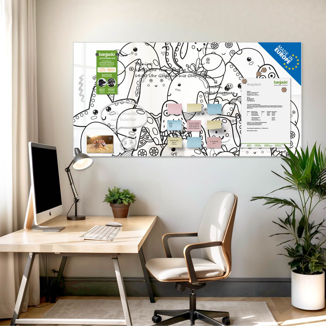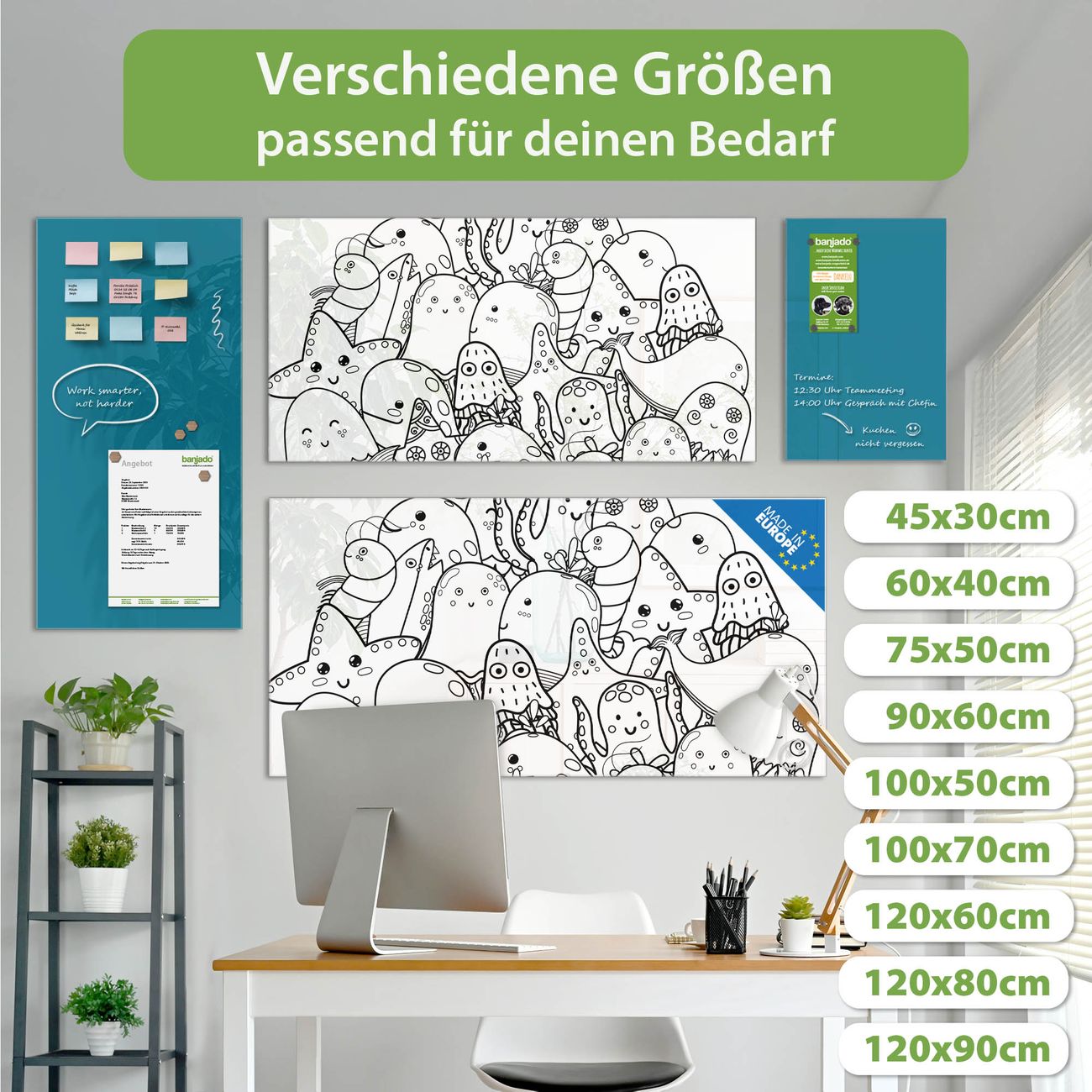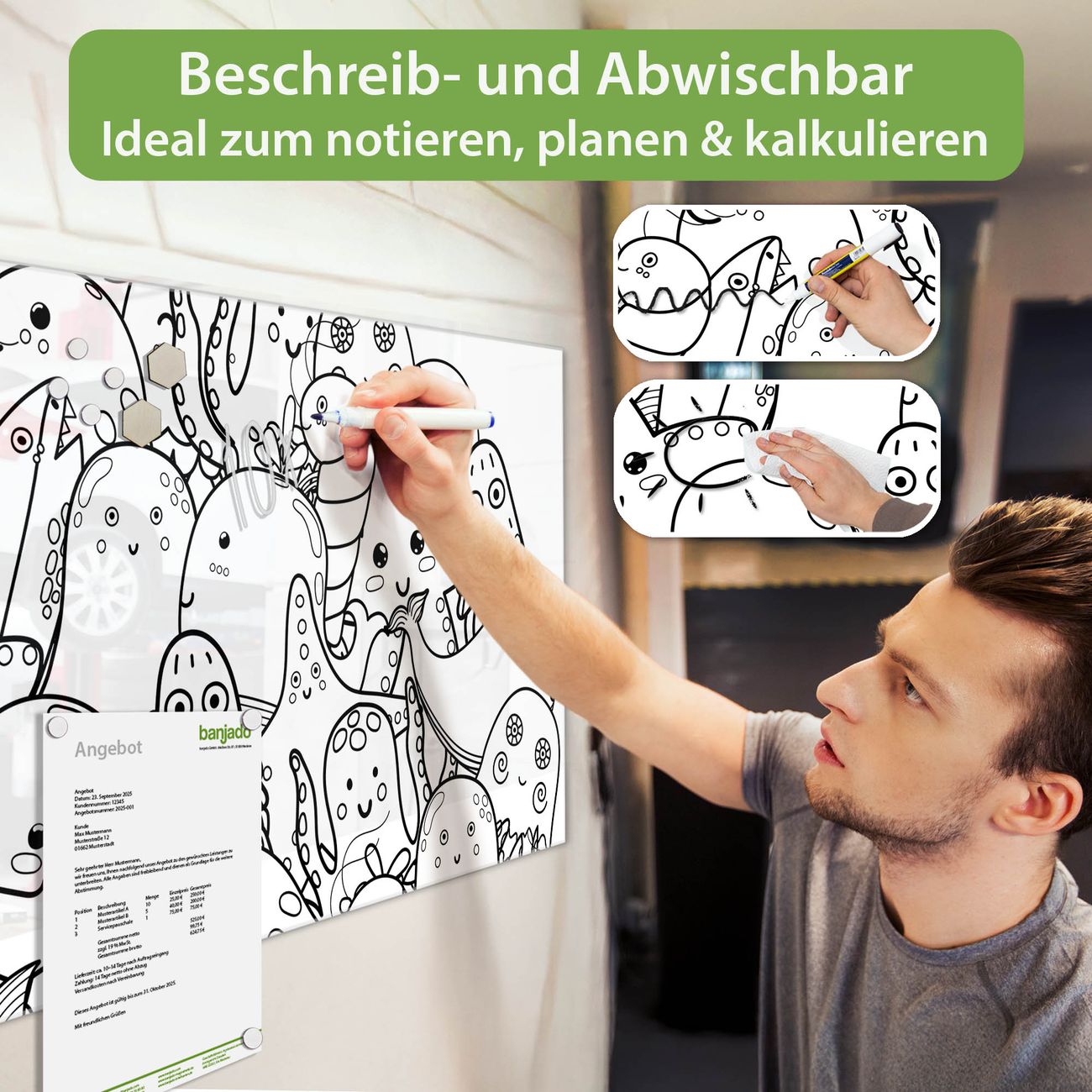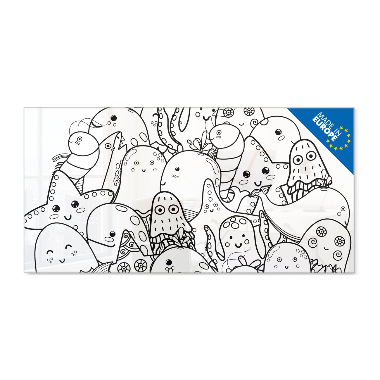 Material: 4mm Sicherheitsglas mit Metallrückwand Eigenschaften: beschreibbar, magnetisch, kratzfest Maße: 100x50x0,6cm, 7,50kg schwer Motiv Nummer 13049 Wassermonsterchen 2 Zubehör: inklusive 4 Neodym-Magnete