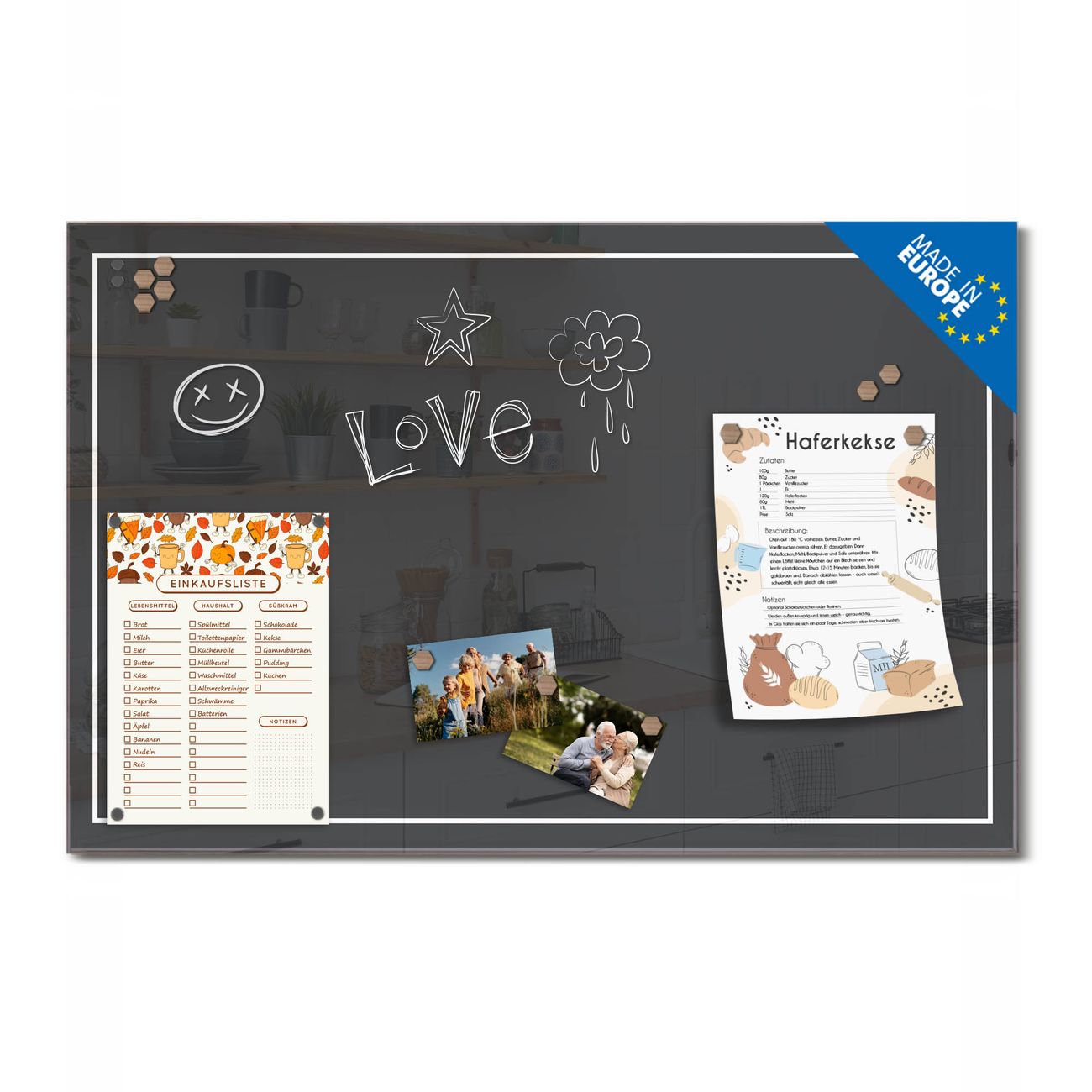 Auf der glatten Glasoberfläche lassen sich Termine, Rezepte oder Notizen ganz einfach mit Kreidestiften festhalten und rückstandslos entfernen. Starke Neodym-Magnete halten Ihre wichtigsten Erinnerungen sicher an Ort und Stelle. So entsteht Ihre ganz persönliche Ideenwand - jeden Tag neu.