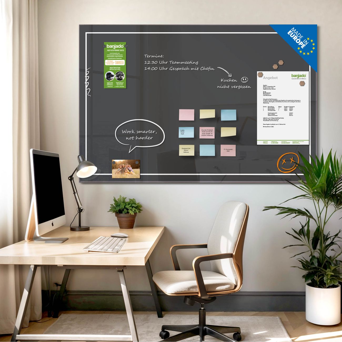 Jede Glas Magnettafel wird in unserer Werkstatt von Hand gefertigt und sorgfältig geprüft. So erhalten Sie ein echtes Qualitätsprodukt, das Funktion und Ästhetik perfekt vereint.?? Warum banjado?
