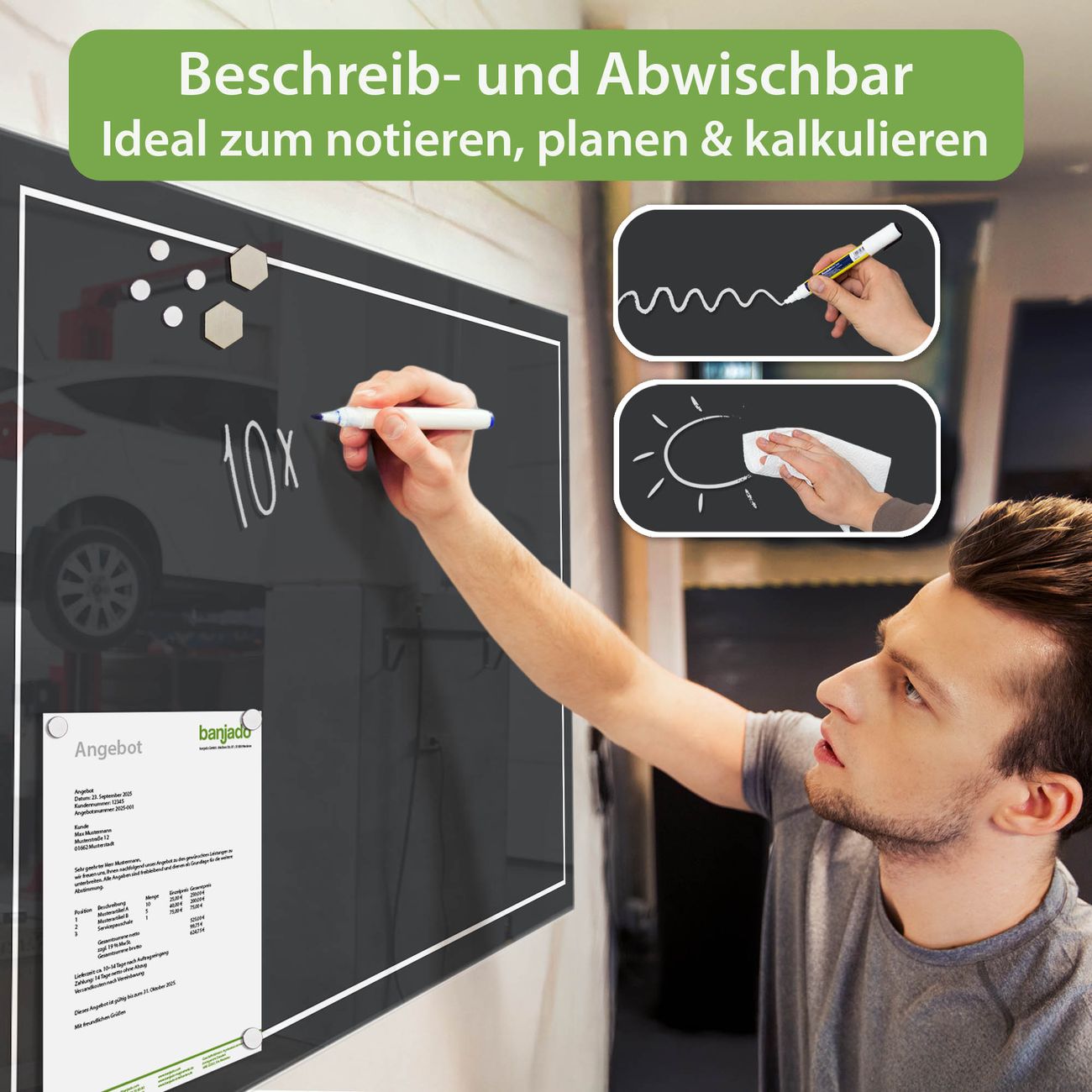 Bitte beachten Sie, dass ausschliessliche spezielle Magnete an der Glastafel haften. Wir empfehlen banjado Neodym Magnete, diese sind durch uns auf Wirksamkeit geprüft.