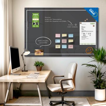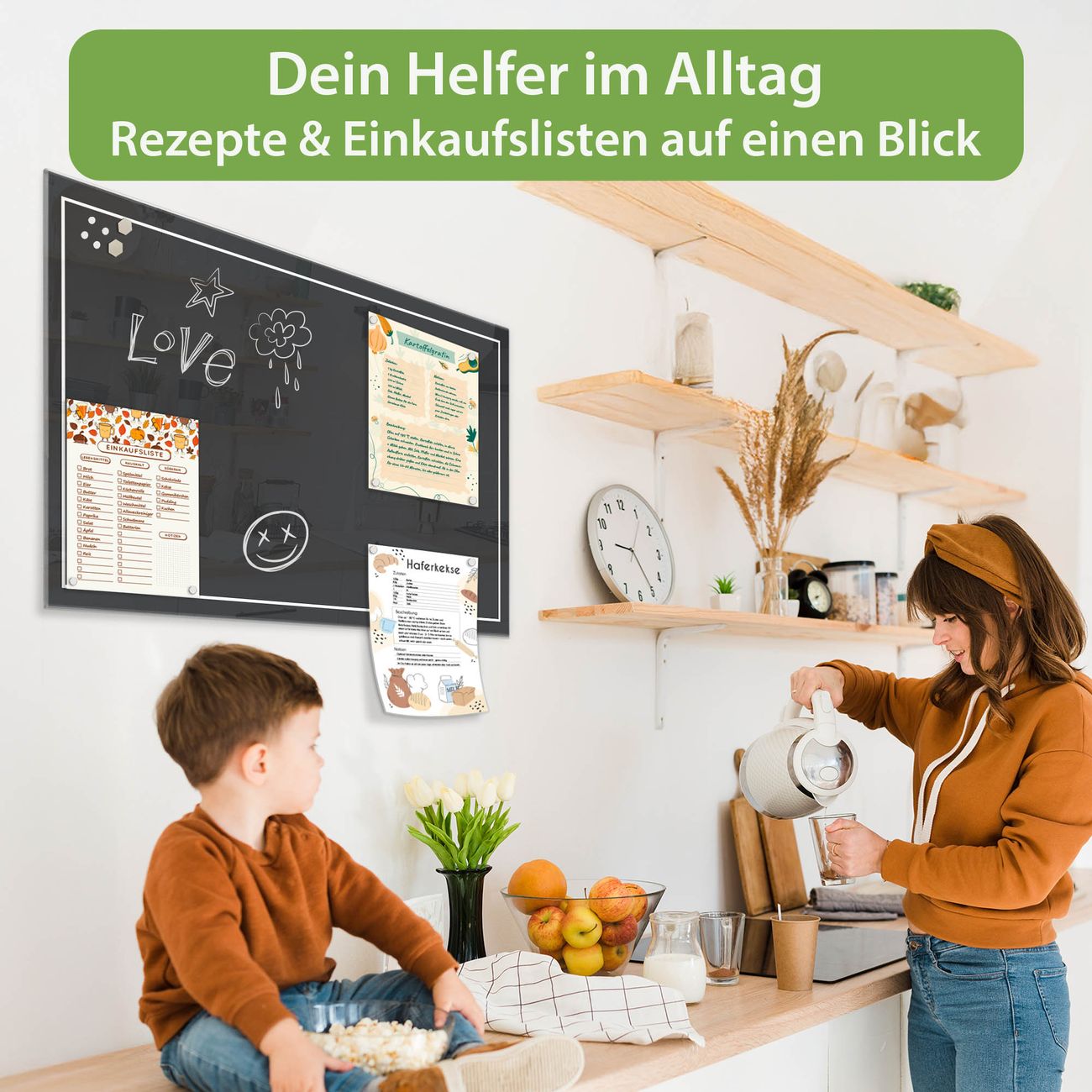 Auf der glatten Glasoberfläche lassen sich Termine, Rezepte oder Notizen ganz einfach mit Kreidestiften festhalten und rückstandslos entfernen. Starke Neodym-Magnete halten Ihre wichtigsten Erinnerungen sicher an Ort und Stelle. So entsteht Ihre ganz persönliche Ideenwand - jeden Tag neu.