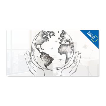 Material: 4mm Sicherheitsglas mit Metallrückwand Eigenschaften: beschreibbar, magnetisch, kratzfest Maße: 100x50x0,6cm, 7,50kg schwer Motiv Nummer 13177 Welt in den Händen Zubehör: inklusive 4 Neodym-Magnete