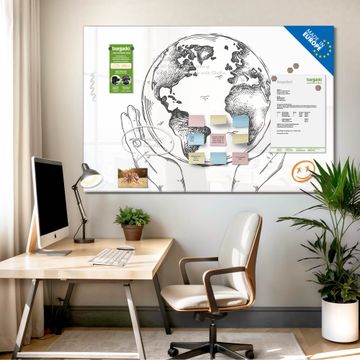 Material: 4mm Sicherheitsglas mit Metallrückwand Eigenschaften: beschreibbar, magnetisch, kratzfest Maße: 120x80x0,6cm, 14,40kg schwer Motiv Nummer 13177 Welt in den Händen Zubehör: inklusive 4 Neodym-Magnete