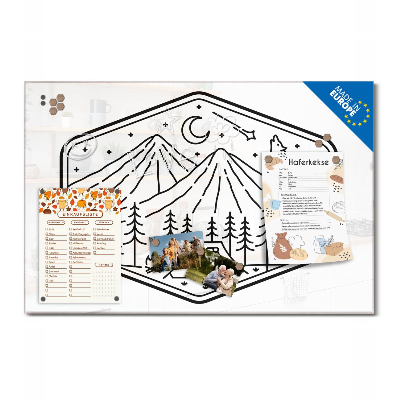 Ein Stück Design, das Ihren Alltag organisiert. Schreiben, heften, inspirieren - alles an einem Ort. Qualität, die man spürt. Montage leicht gemacht. Handwerk mit Herz - veredelt in Sachsen. Einzigartiges Design mit Motiv Motiv Wilde Naturlandschaft Beschreibbare Glasoberfläche, leicht zu reinigen Starke Magnetkraft durch Stahlrückwand Inklusive 4 Neodym-Magneten Flexible Montageoptionen Handveredelt in Sachsen - Qualität, die bleibt