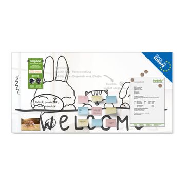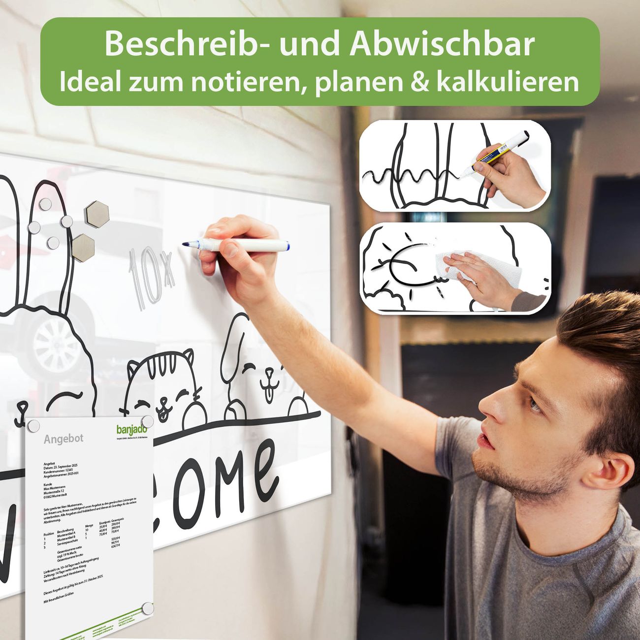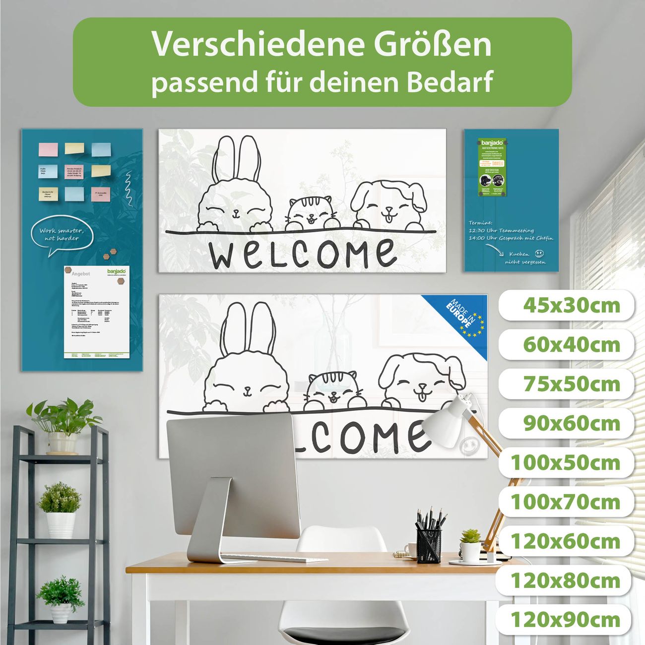 Material: 4mm Sicherheitsglas mit Metallrückwand Eigenschaften: beschreibbar, magnetisch, kratzfest Maße: 100x50x0,6cm, 7,50kg schwer Motiv Nummer 13372 Willkommensfreunde Zubehör: inklusive 4 Neodym-Magnete
