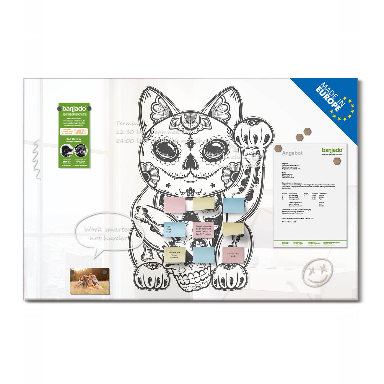 Jede Glas Magnettafel wird in unserer Werkstatt von Hand gefertigt und sorgfältig geprüft. So erhalten Sie ein echtes Qualitätsprodukt, das Funktion und Ästhetik perfekt vereint.?? Warum banjado?