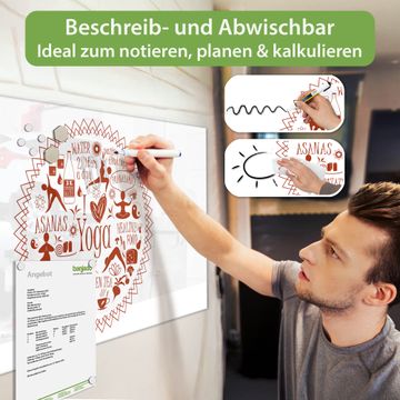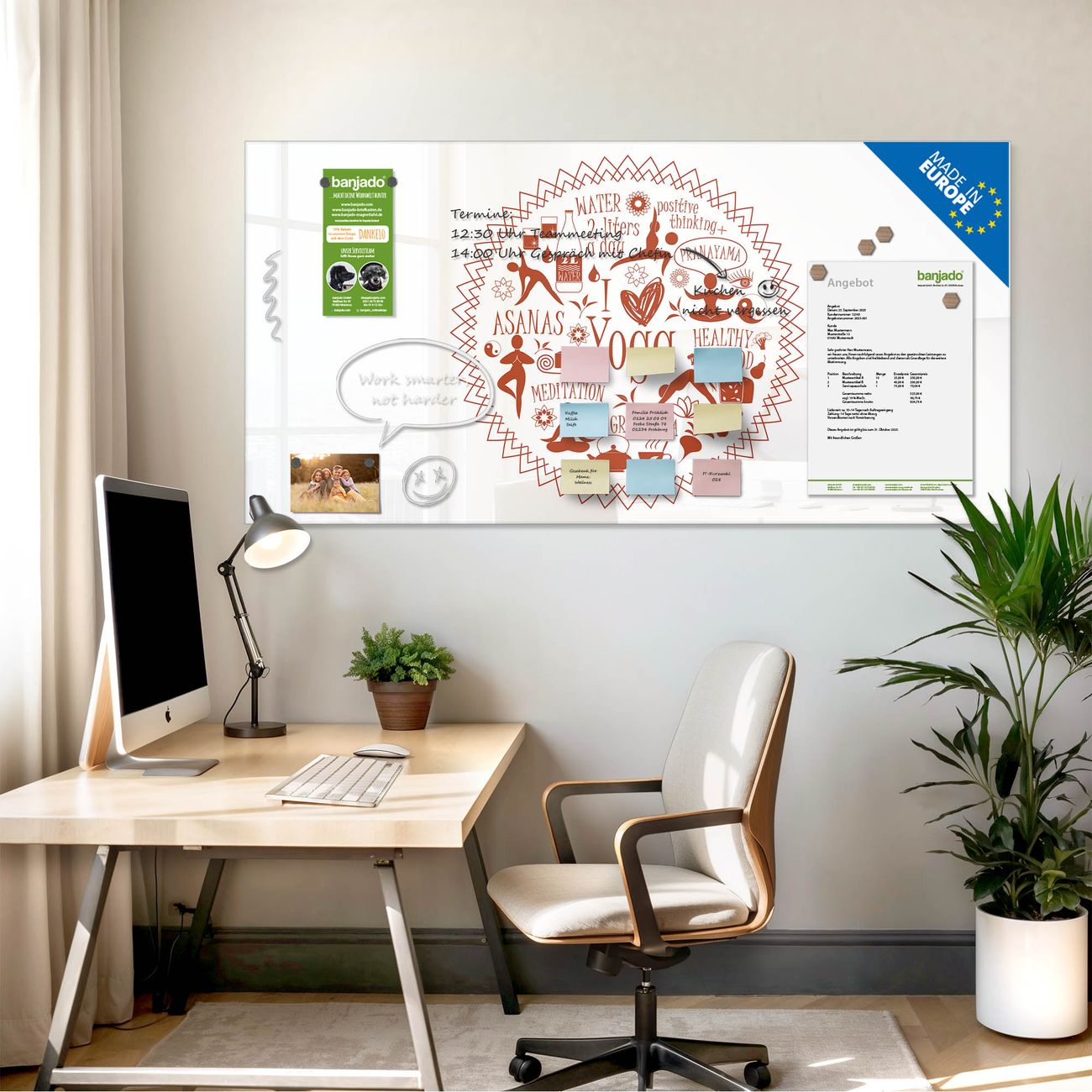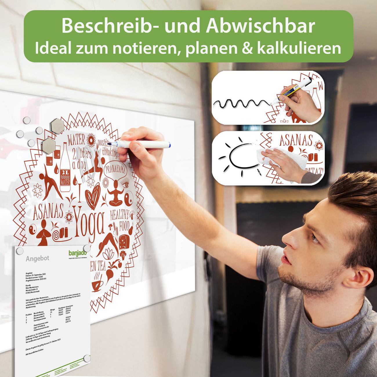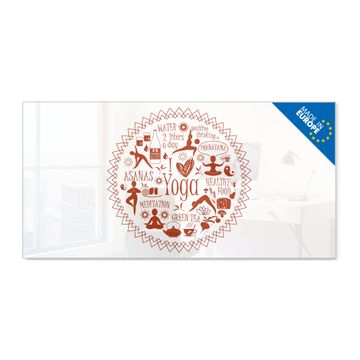 Material: 4mm Sicherheitsglas mit Metallrückwand Eigenschaften: beschreibbar, magnetisch, kratzfest Maße: 100x50x0,6cm, 7,50kg schwer Motiv Nummer 13390 Yoga und Achtsamkeit Zubehör: inklusive 4 Neodym-Magnete