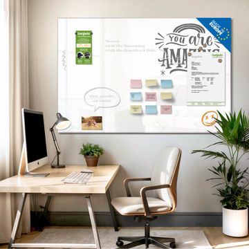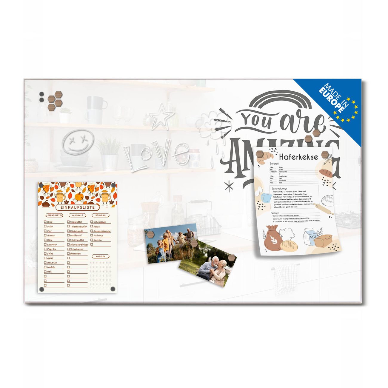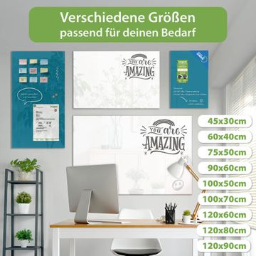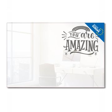 Material: 4mm Sicherheitsglas mit Metallrückwand Eigenschaften: beschreibbar, magnetisch, kratzfest Maße: 75x50x0,6cm, 5,63kg schwer Motiv Nummer 13366 You Are Amazing Spruch Zubehör: inklusive 4 Neodym-Magnete