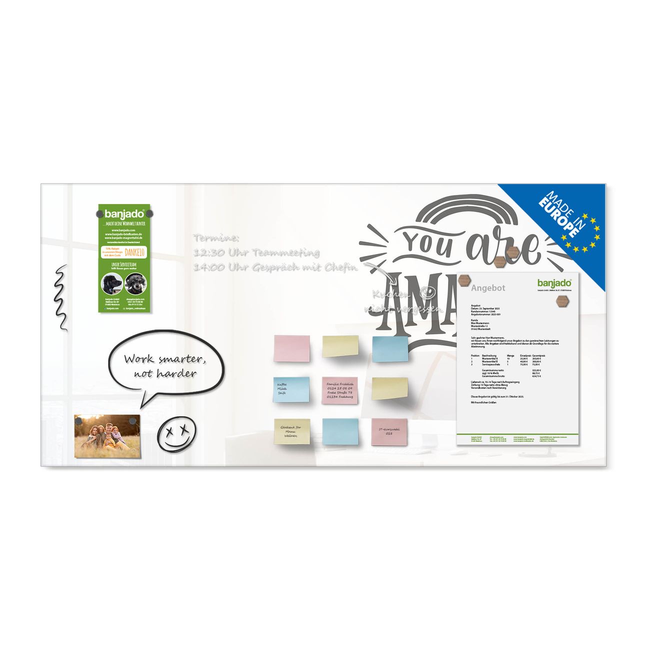 Jede Glas Magnettafel wird in unserer Werkstatt von Hand gefertigt und sorgfältig geprüft. So erhalten Sie ein echtes Qualitätsprodukt, das Funktion und Ästhetik perfekt vereint.?? Warum banjado?