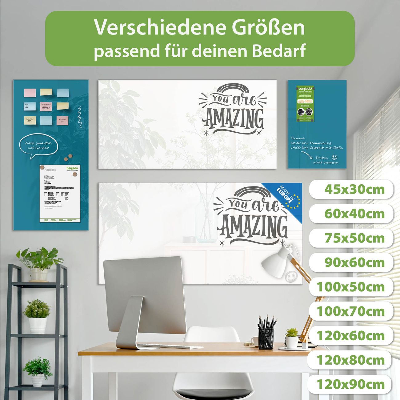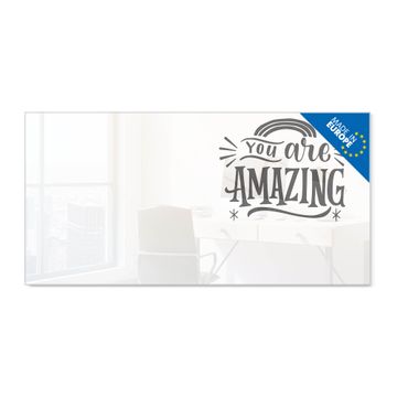 Material: 4mm Sicherheitsglas mit Metallrückwand Eigenschaften: beschreibbar, magnetisch, kratzfest Maße: 100x50x0,6cm, 7,50kg schwer Motiv Nummer 13366 You Are Amazing Spruch Zubehör: inklusive 4 Neodym-Magnete