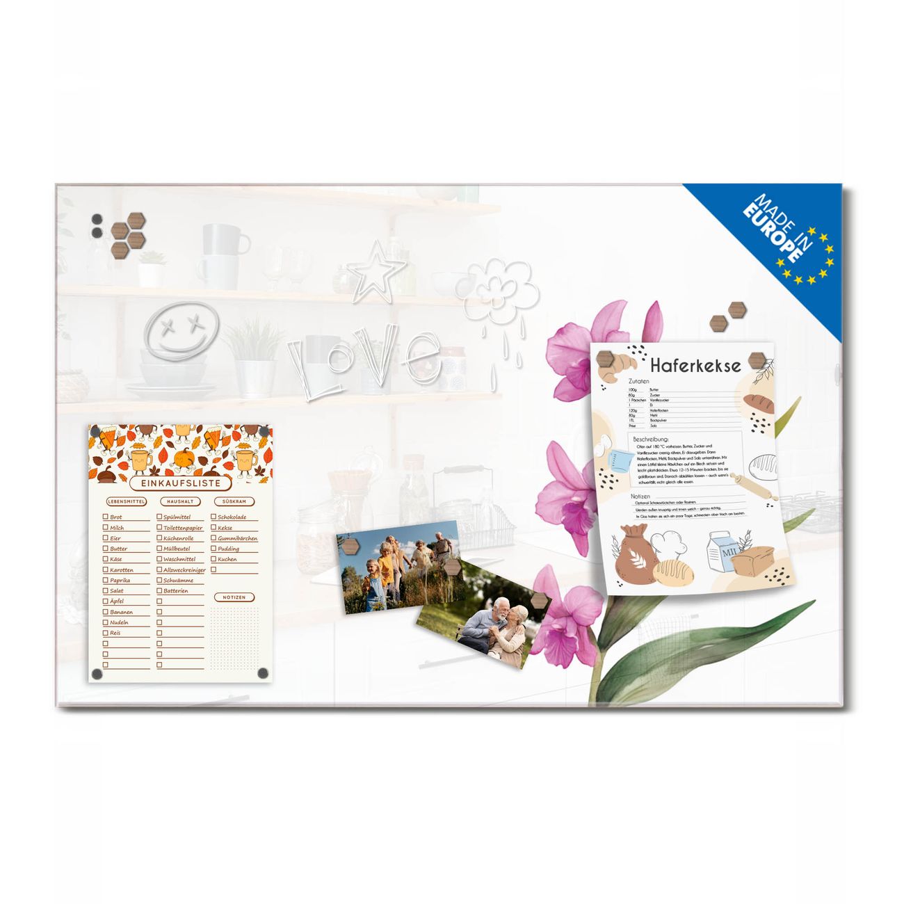 Auf der glatten Glasoberfläche lassen sich Termine, Rezepte oder Notizen ganz einfach mit Kreidestiften festhalten und rückstandslos entfernen. Starke Neodym-Magnete halten Ihre wichtigsten Erinnerungen sicher an Ort und Stelle. So entsteht Ihre ganz persönliche Ideenwand - jeden Tag neu.