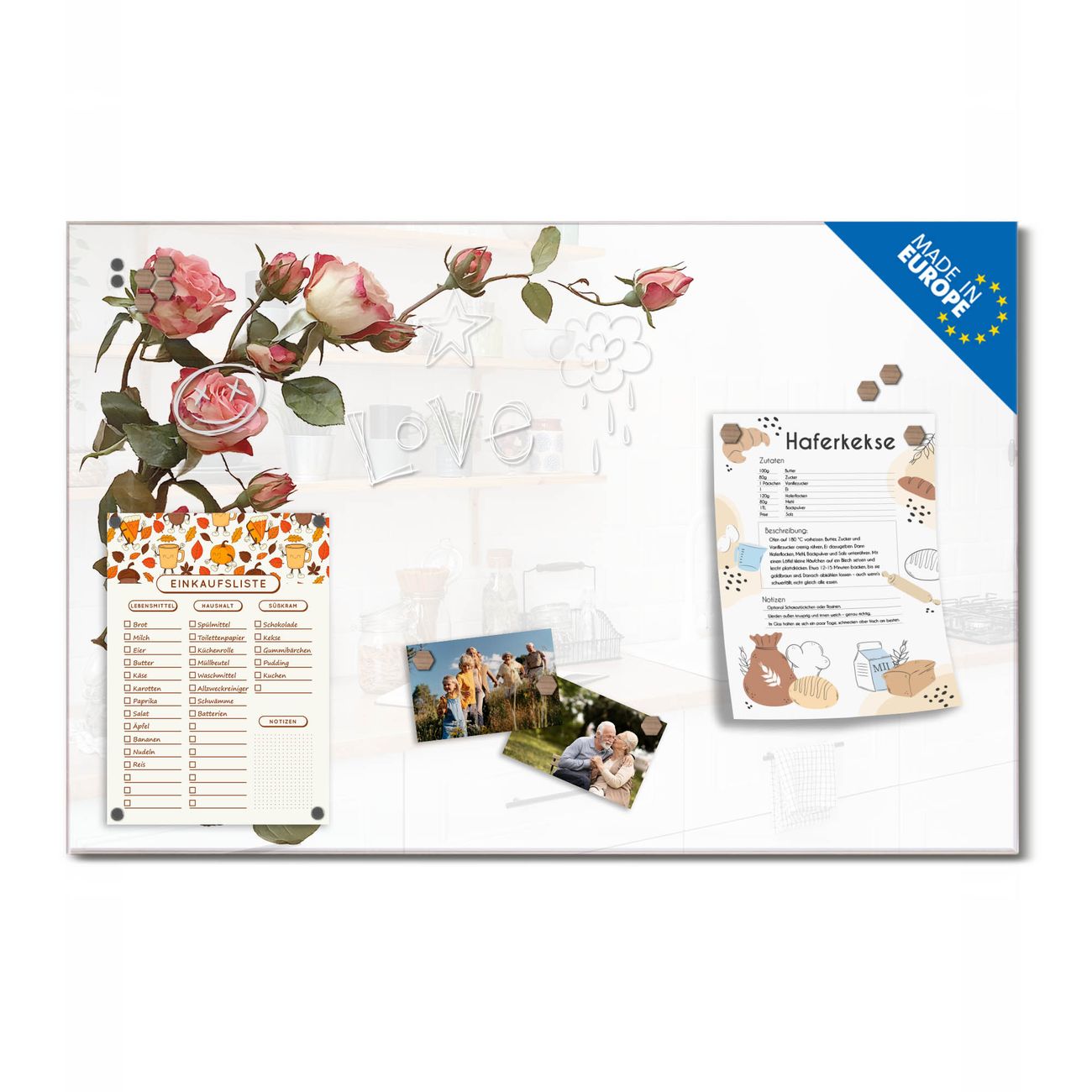 Ein Stück Design, das Ihren Alltag organisiert. Schreiben, heften, inspirieren - alles an einem Ort. Qualität, die man spürt. Montage leicht gemacht. Handwerk mit Herz - veredelt in Sachsen. Einzigartiges Design mit Motiv Motiv Zarte Rosenpracht Beschreibbare Glasoberfläche, leicht zu reinigen Starke Magnetkraft durch Stahlrückwand Inklusive 4 Neodym-Magneten Flexible Montageoptionen Handveredelt in Sachsen - Qualität, die bleibt